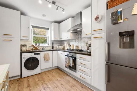 Single drainer one and a half bowl stainless steel sink, mixer tap over, good range of built-in base and wall units including drawers, built-in electric oven, 4 ring gas hob, stainless steel extractor over, space and plumbing for washing machine, cupboard housing Baxi gas fired central heating/hot water boiler, recess for fridge/freezer, 2 radiators, stairs off to first floor and stairs with open balustrade giving a lovely open feel down to the