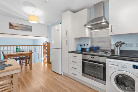 A pleasant modern fitted kitchen comprising single drainer one and a half bowl stainless steel sink with mixer tap over, good range of built in base and wall cupboards including drawers, roll edge worktops with matching splashbacks, built in Electrolux oven, 4 ring gas hob, stainless steel splashback and extractor hood, space and plumbing for washing machine and slimline dishwasher, cupboard housing Baxi gas fired central heating hot water boiler, double glazed window to front, 2 radiators, balustrade with steps down to the
