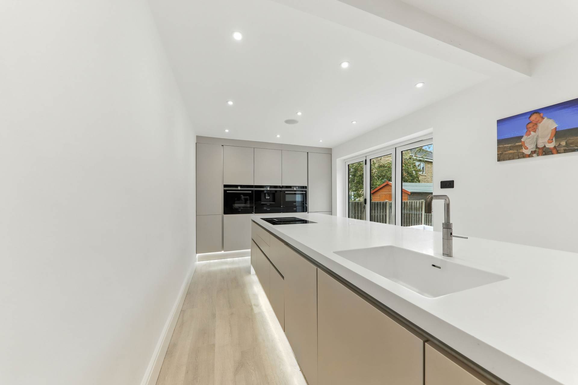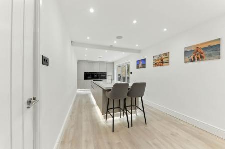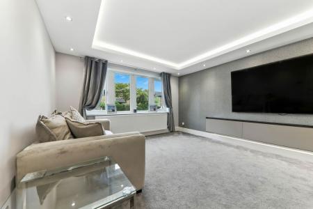 The highlight of the home is the impressive kitchen/dining area. Flooded with natural light from bi-folding doors that open to the rear garden, this space offers the perfect balance of style and functionality. The bespoke kitchen features a striking central island with additional seating, quartz worktops, and a pop-up island socket, ensuring practicality blends seamlessly with design. Integrated Siemens appliances include a coffee machine, double oven, wine cooler, self venting hob, dishwasher, washing machine, 70/30 fridge freezer, and a built-in bin system. A Quooker boiling water tap adds further luxury and convenience, while ambient lighting and ceiling speakers elevate the space to the next level.