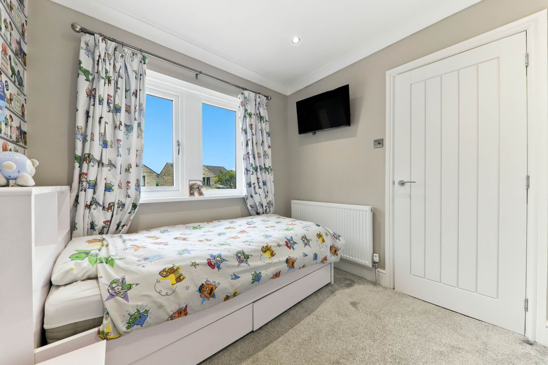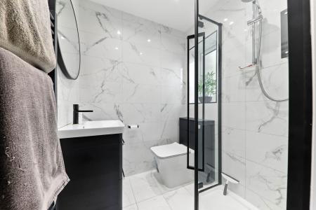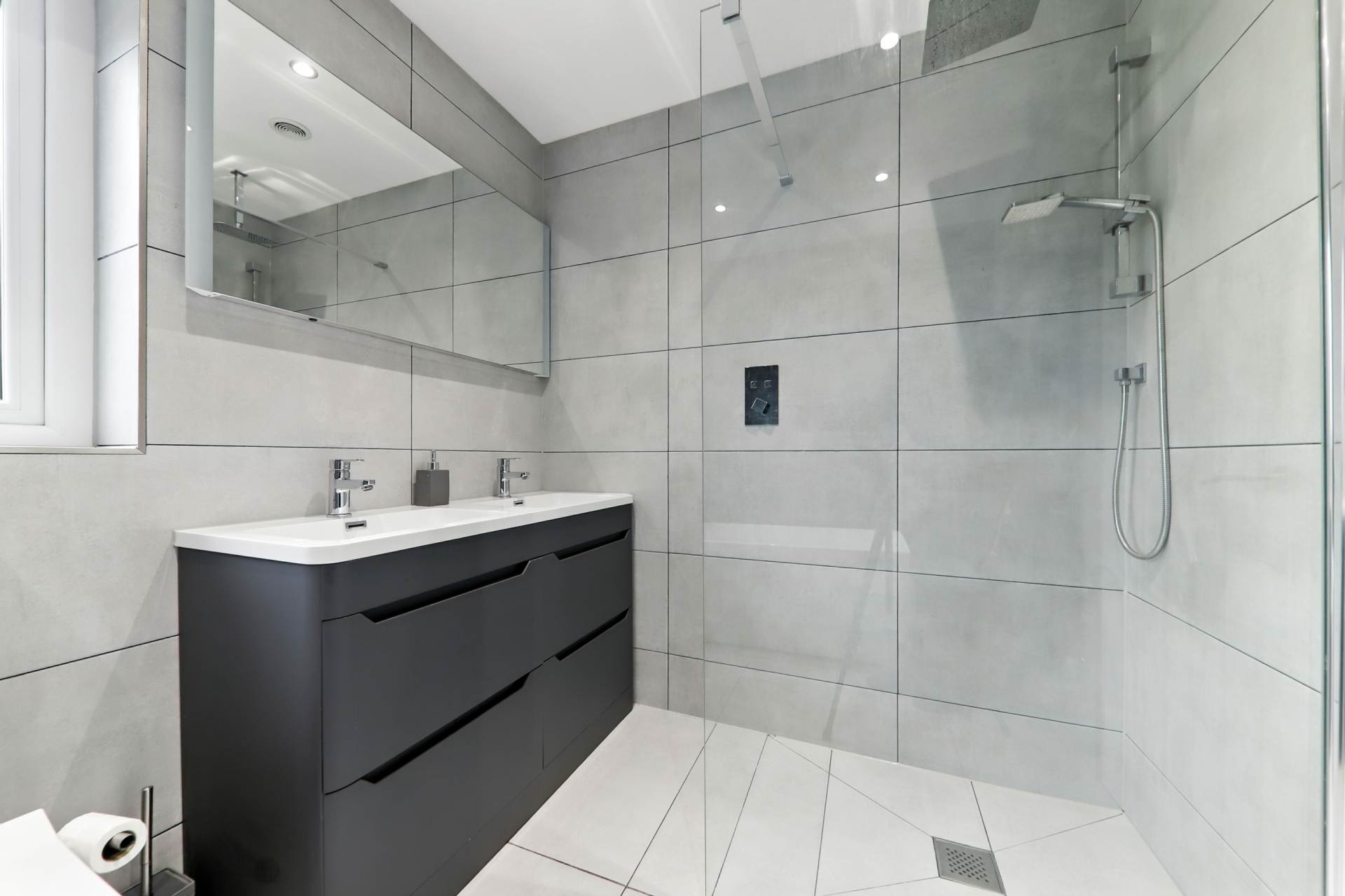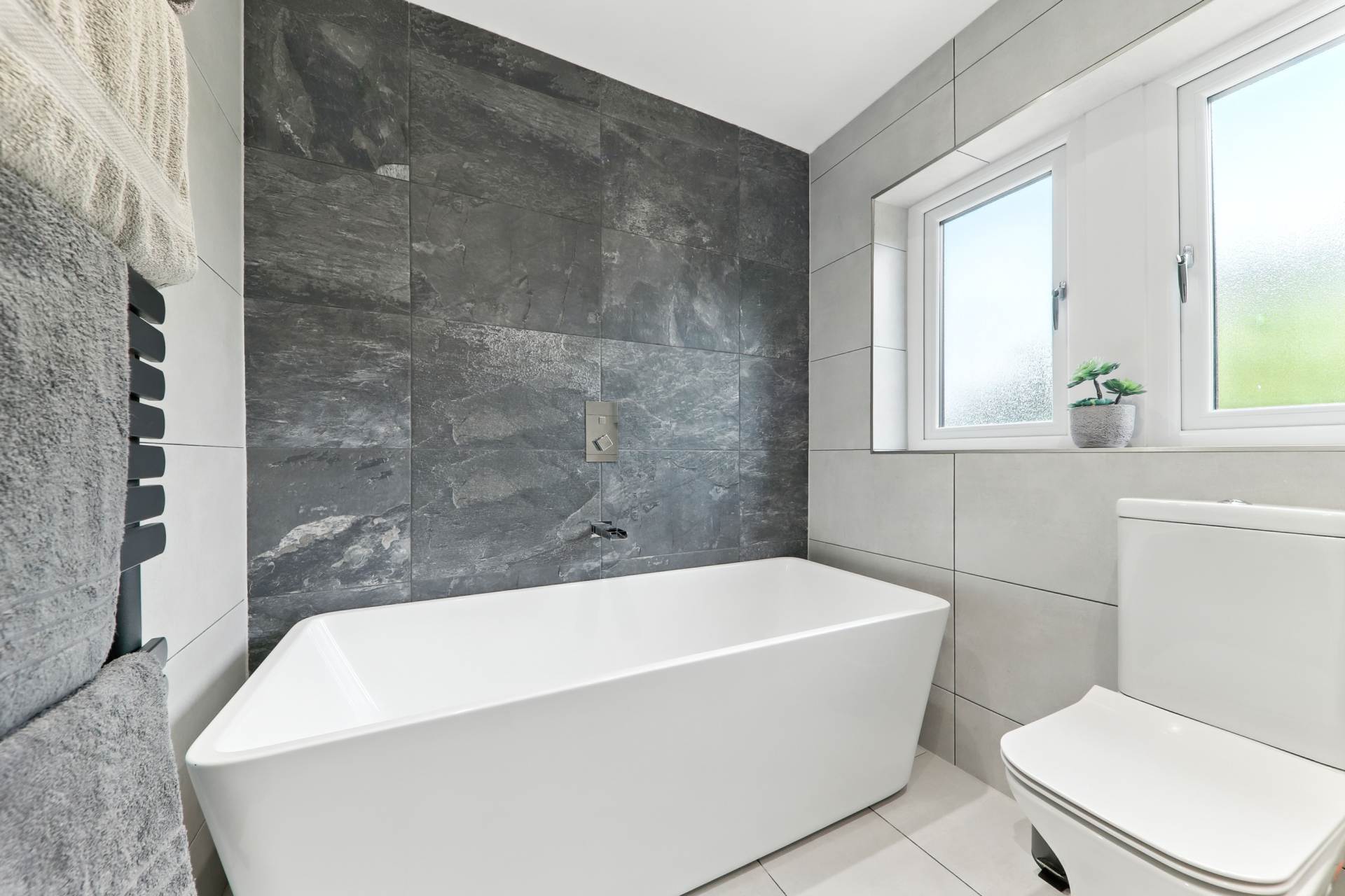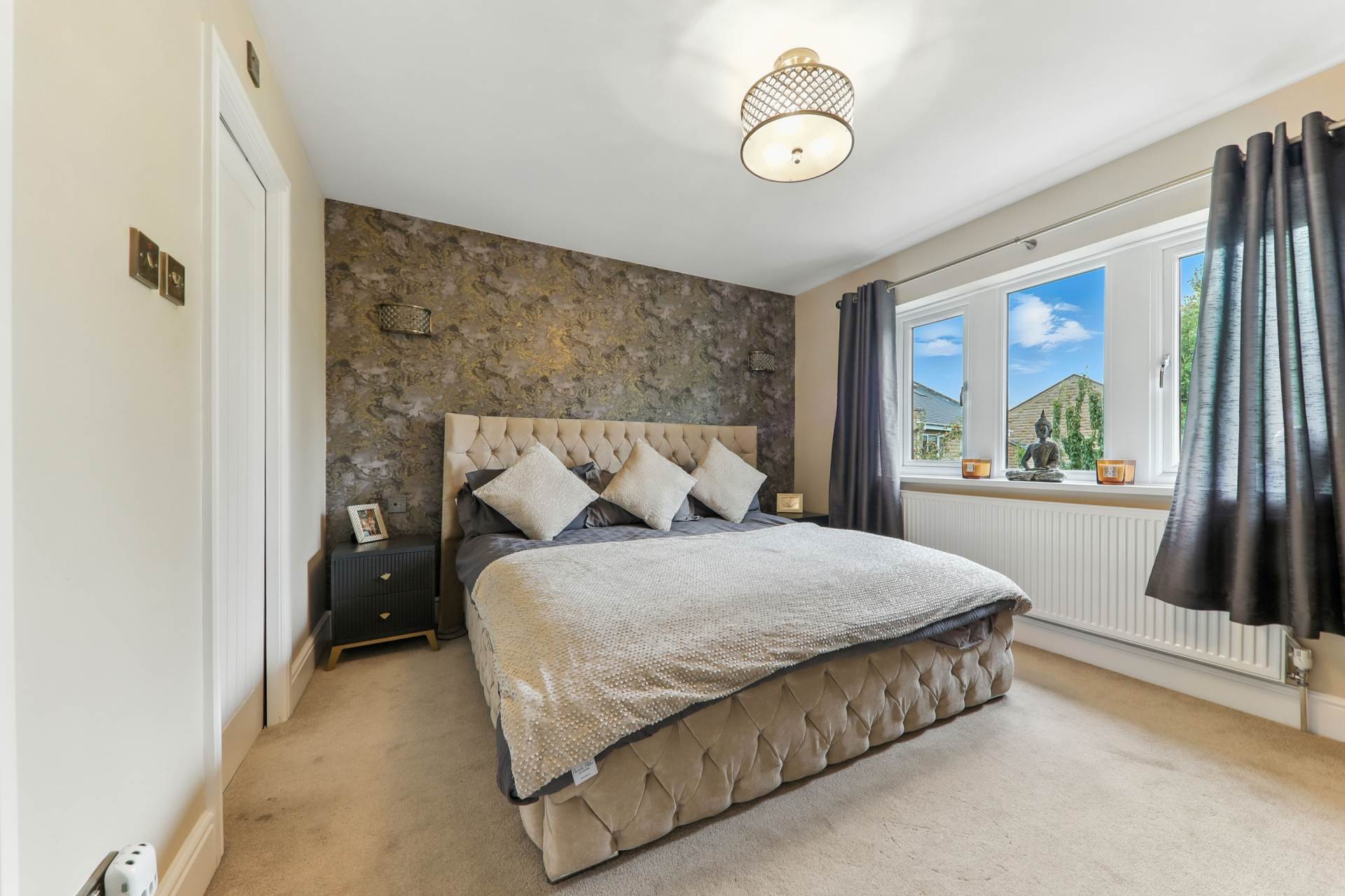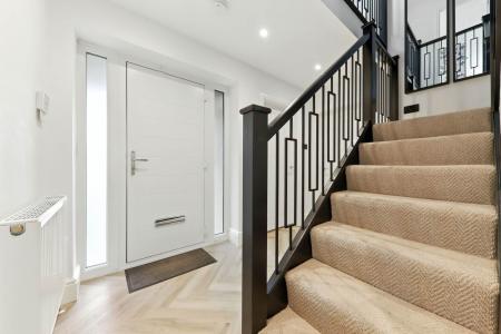Upstairs, the stunning feature hallway leads to the master suite, complete with a walk-in wardrobe and a fully tiled en-suite shower room. The second double bedroom benefits from fitted wardrobes, along with two further double bedrooms. The luxurious four piece family bathroom is beautifully appointed, offering a walk-in shower, free standing bath, and twin sinks.
