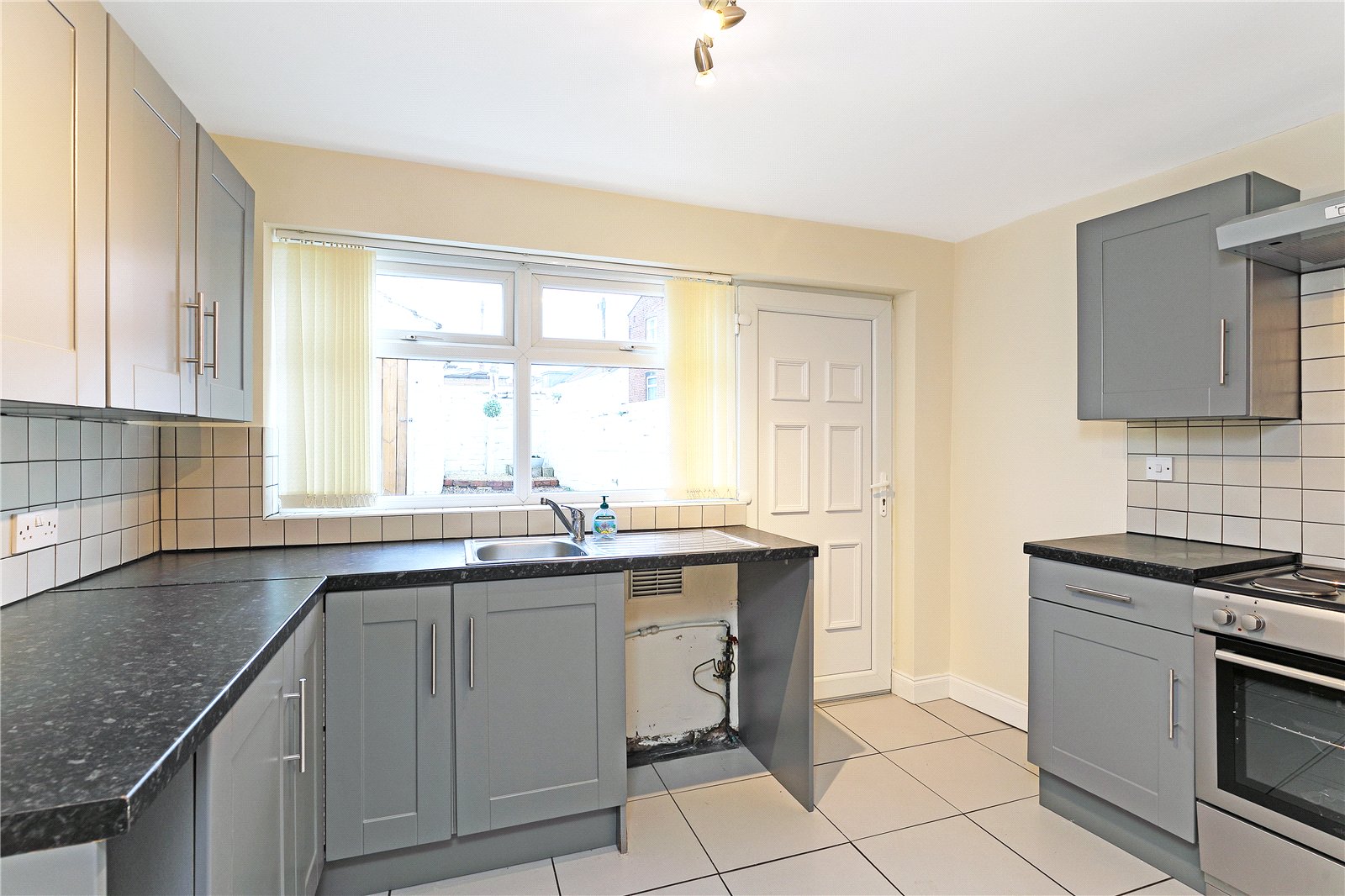 Kitchen 7'6" x 3.39, (2.29m x 3.39,). Fitted with a matching range of grey shaker style fronted wall and base units, contrasting worktop areas, stainless steel sink unit, single drainer, fitted electric oven with extractor hood over, plumbing for automatic washing machine, tiling between the work tops and wall units, tiled floor, double glazed window and rear entrance door.