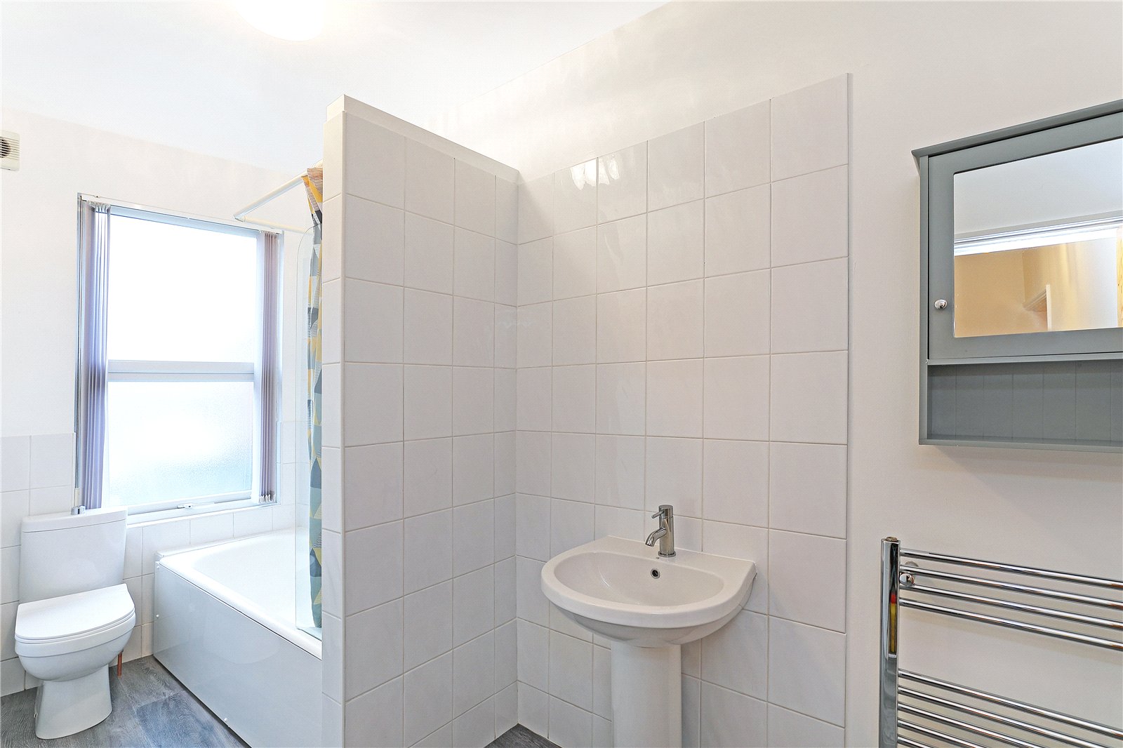 Bathroom Furnished with modern white suite comprising pedestal wash basin, low flush wc., panelled bath with shower attachment, tiling, double glazed window, chrome heated towel rail.