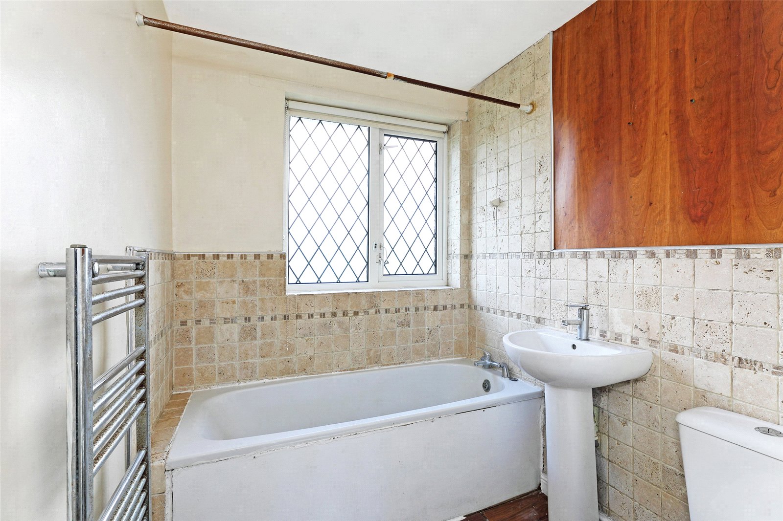 House Bathroom Furnished with modern white suite comprising pedestal wash basin, low flush w/c, panelled bath, tiling, chrome heated towel rail, storage cupboard containing combination central heating boiler.