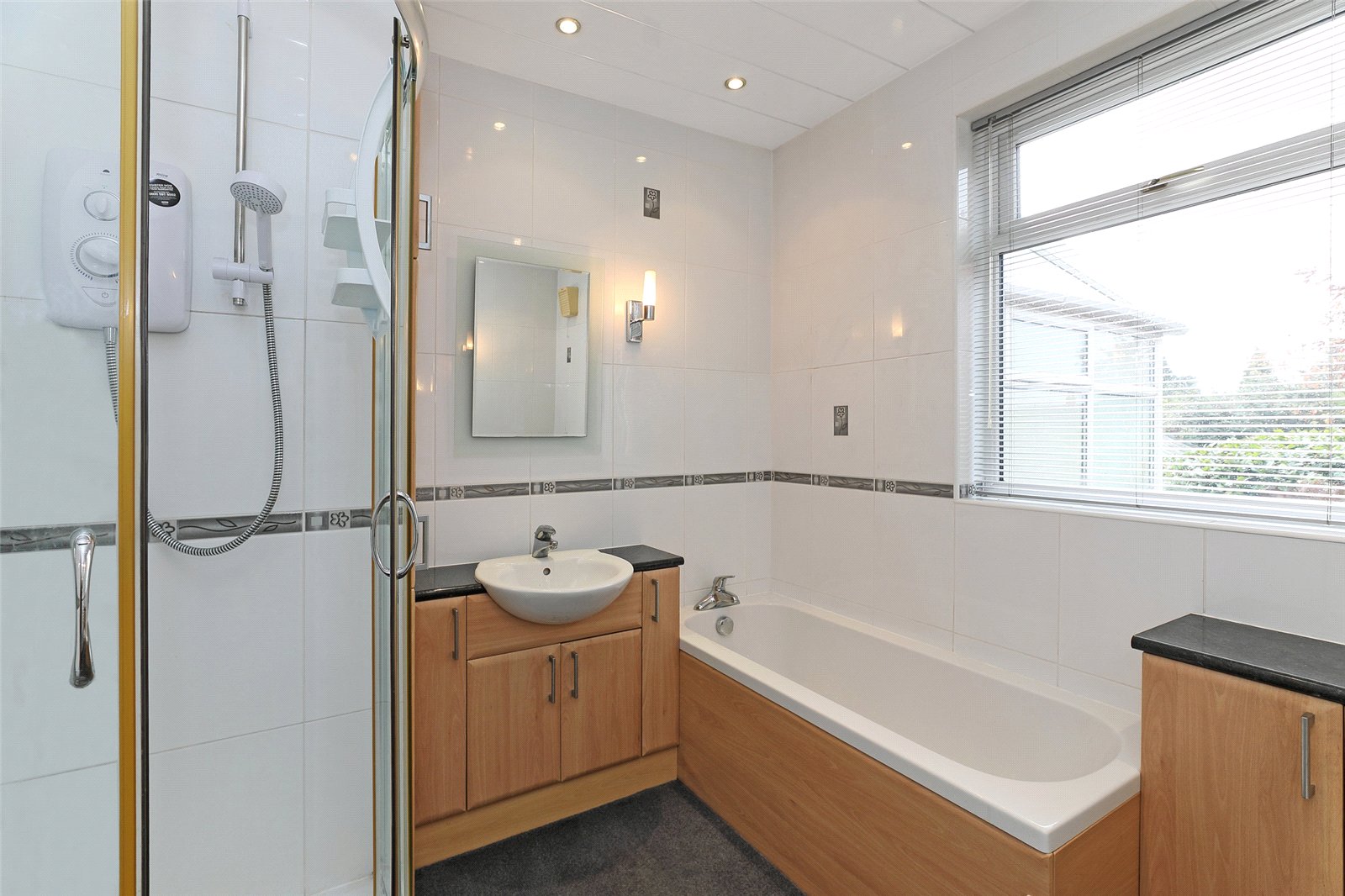 House Bathroom Furnished with modern white suite comprising wash hand basin, low flush w.c, set in back to wall furniture, panelled bath, separate shower cubicle with electric shower, tiling, double glazed window, chrome heated towel rail.