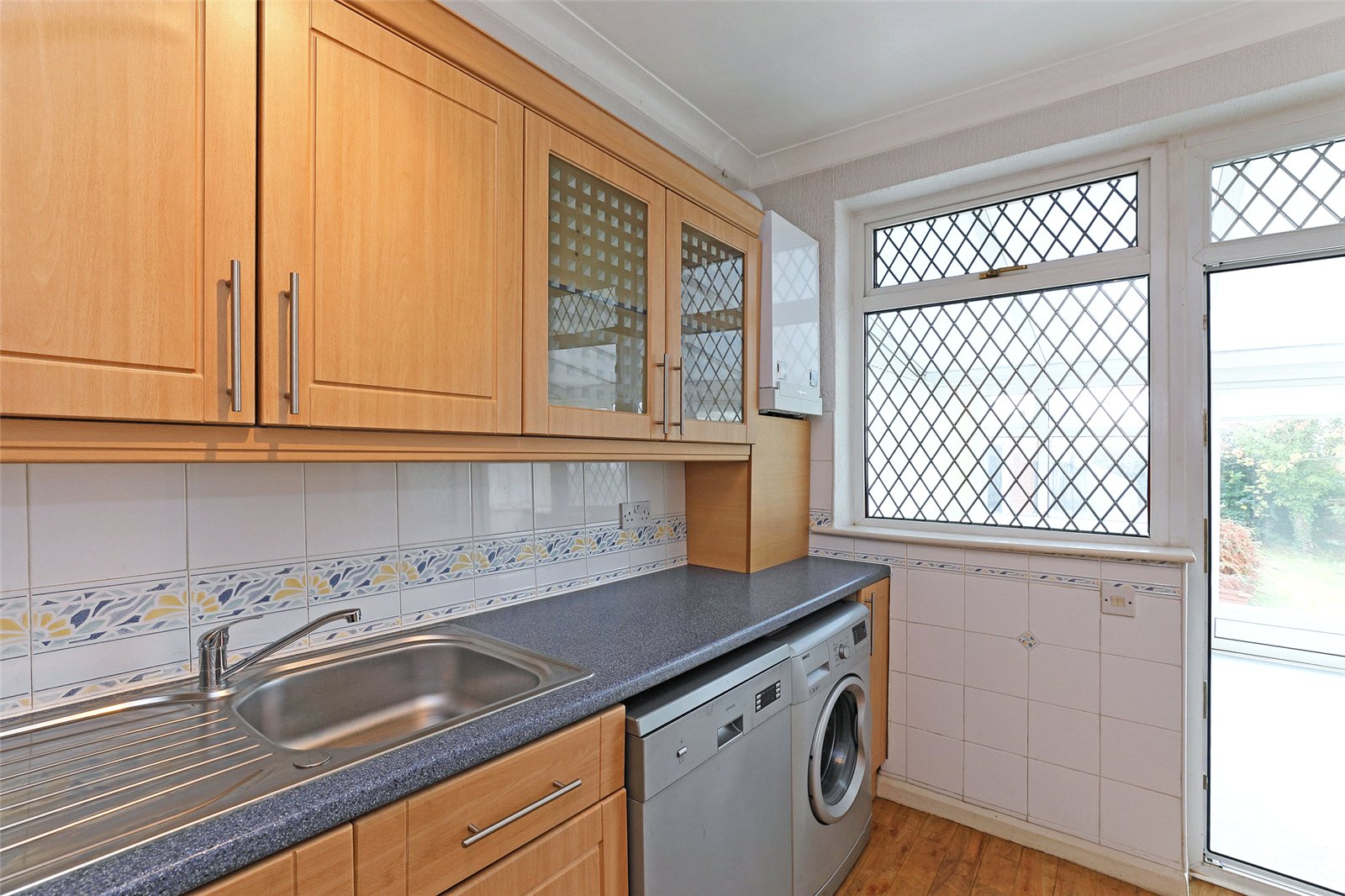 Kitchen 11'3" x 7'10" (3.43m x 2.4m). With a matching range of light oak effect fronted wall and base units, worktop areas, stainless steel sink unit, single drainer, plumbing for automatic washing machine and dishwasher, fitted oven and hob with extractor hood over, tiling between the worktops and wall units, oak flooring, central heating boiler, double glazed window and rear entrance door.