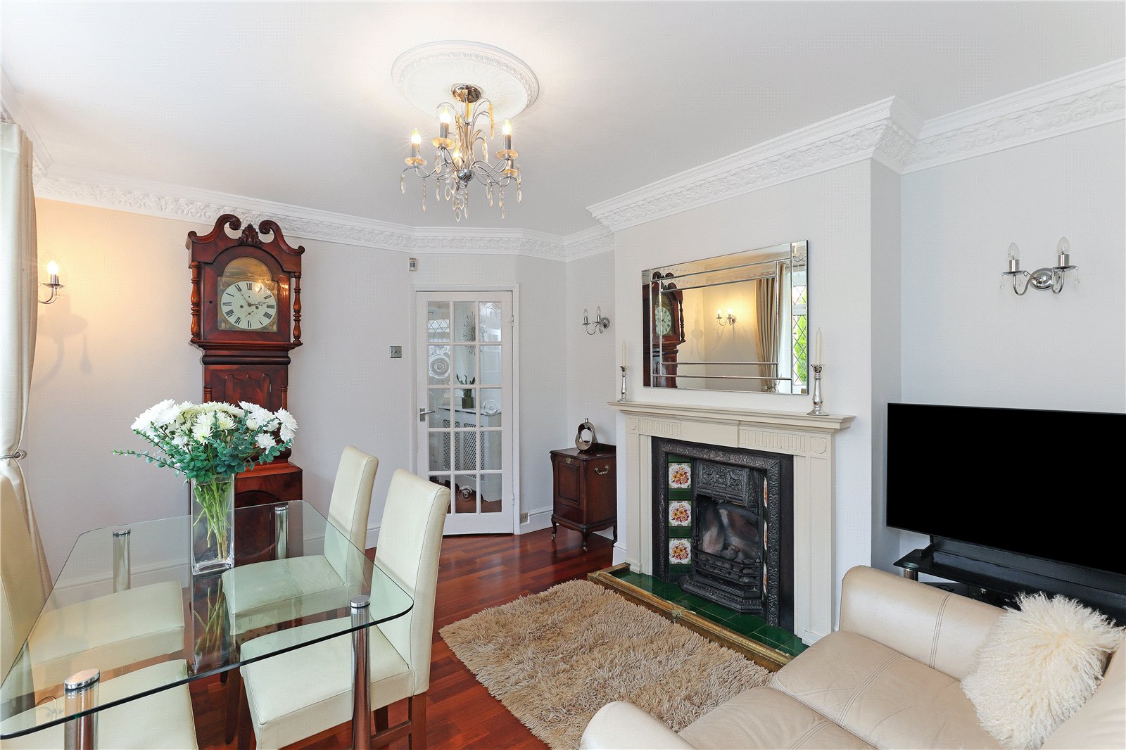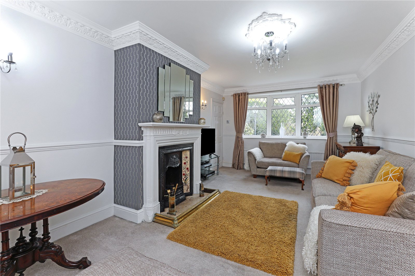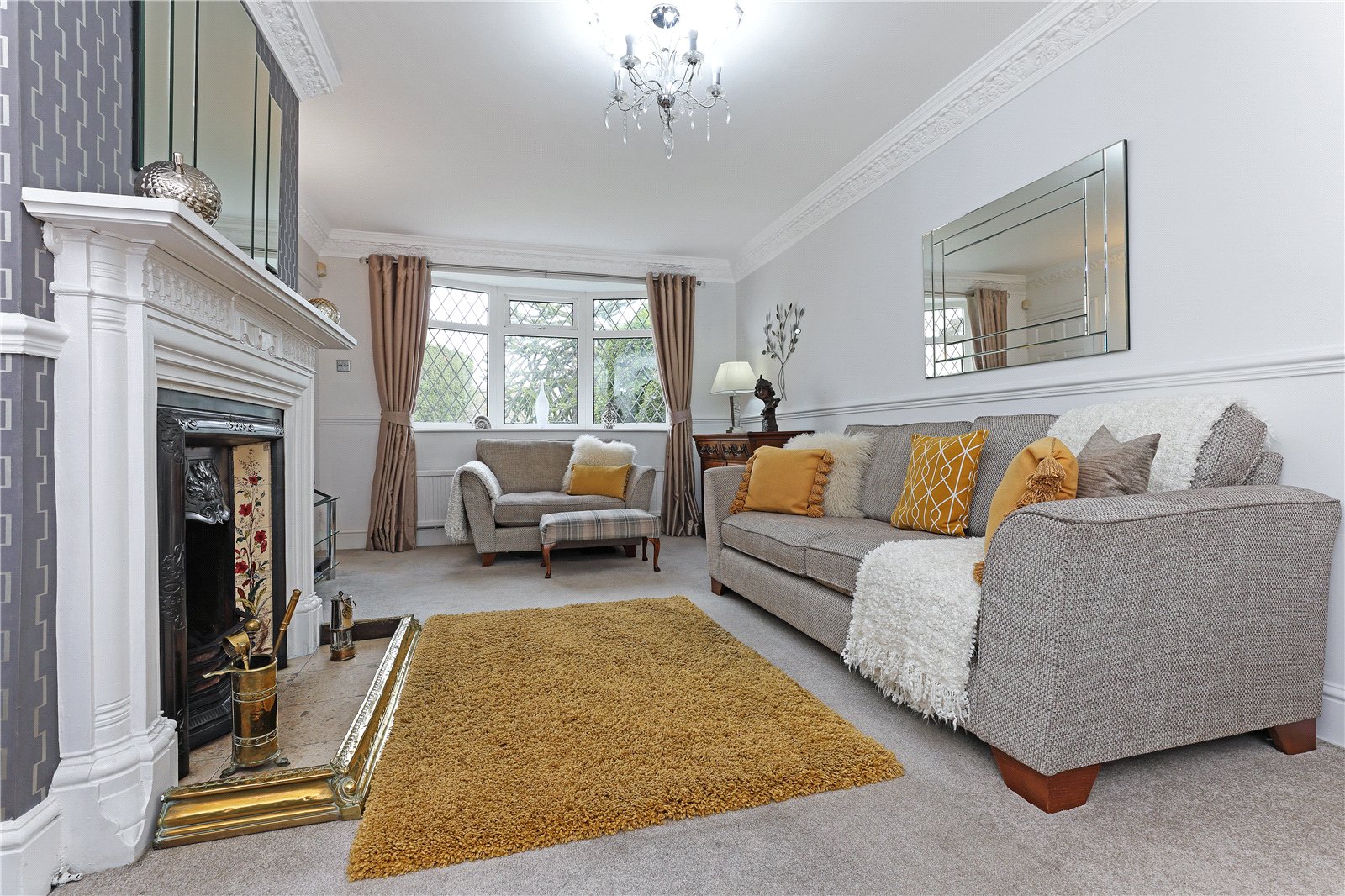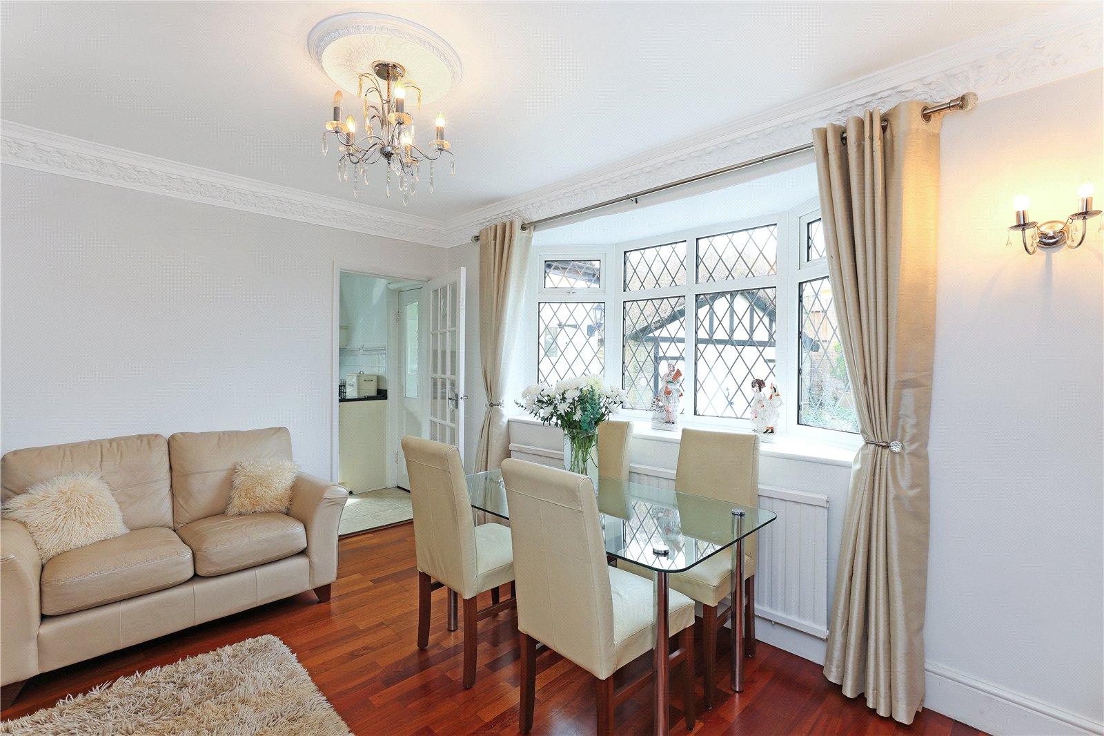 Formal Dining Room 13'2" x 10'11" (4.01m x 3.33m). Having feature fire surround with cast iron inset and tiled, with fitted flame effect gas fire, four wall light points, double glazed feature bow window to the side, single panel radiator.