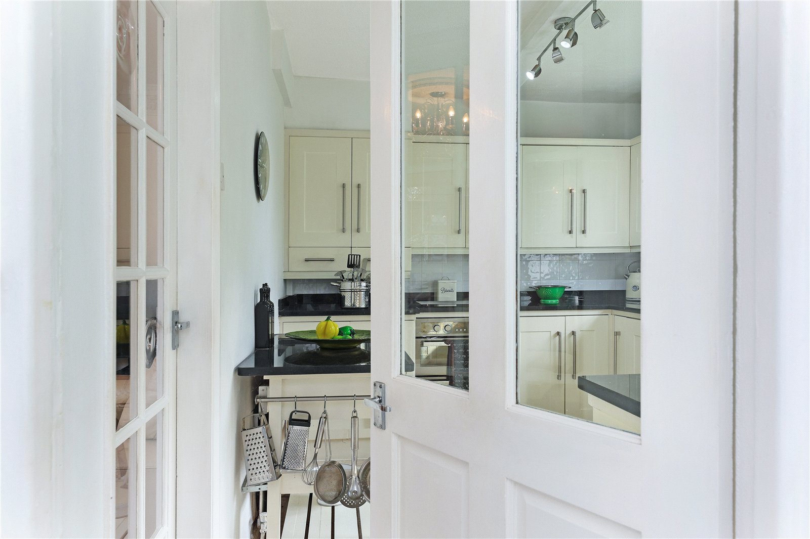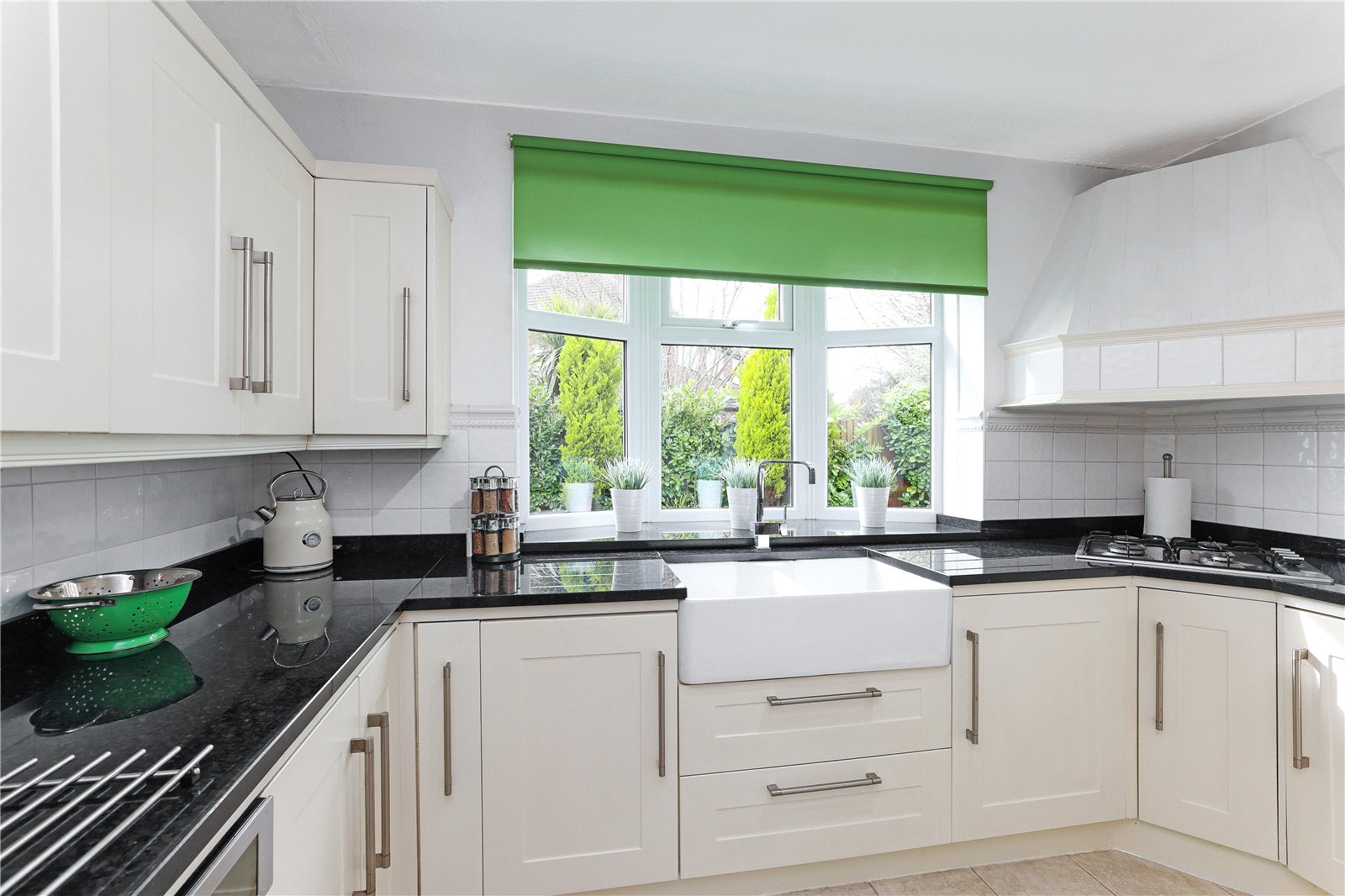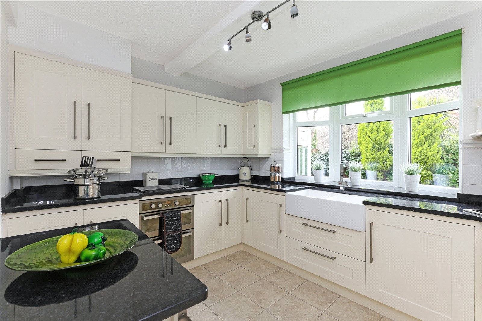 Kitchen 8'10" x 11'1" (2.7m x 3.38m). Fitted with a matching range of cream shaker style fronted wall and base units, contrasting granite worktops with feature double Belfast sink with mixer tap unit, built in double oven, gas hob with extractor hood over, integrated fridge, central heating boiler, tiling between the worktops and wall units, double glazed bow window overlooking the rear garden, double panel radiator.