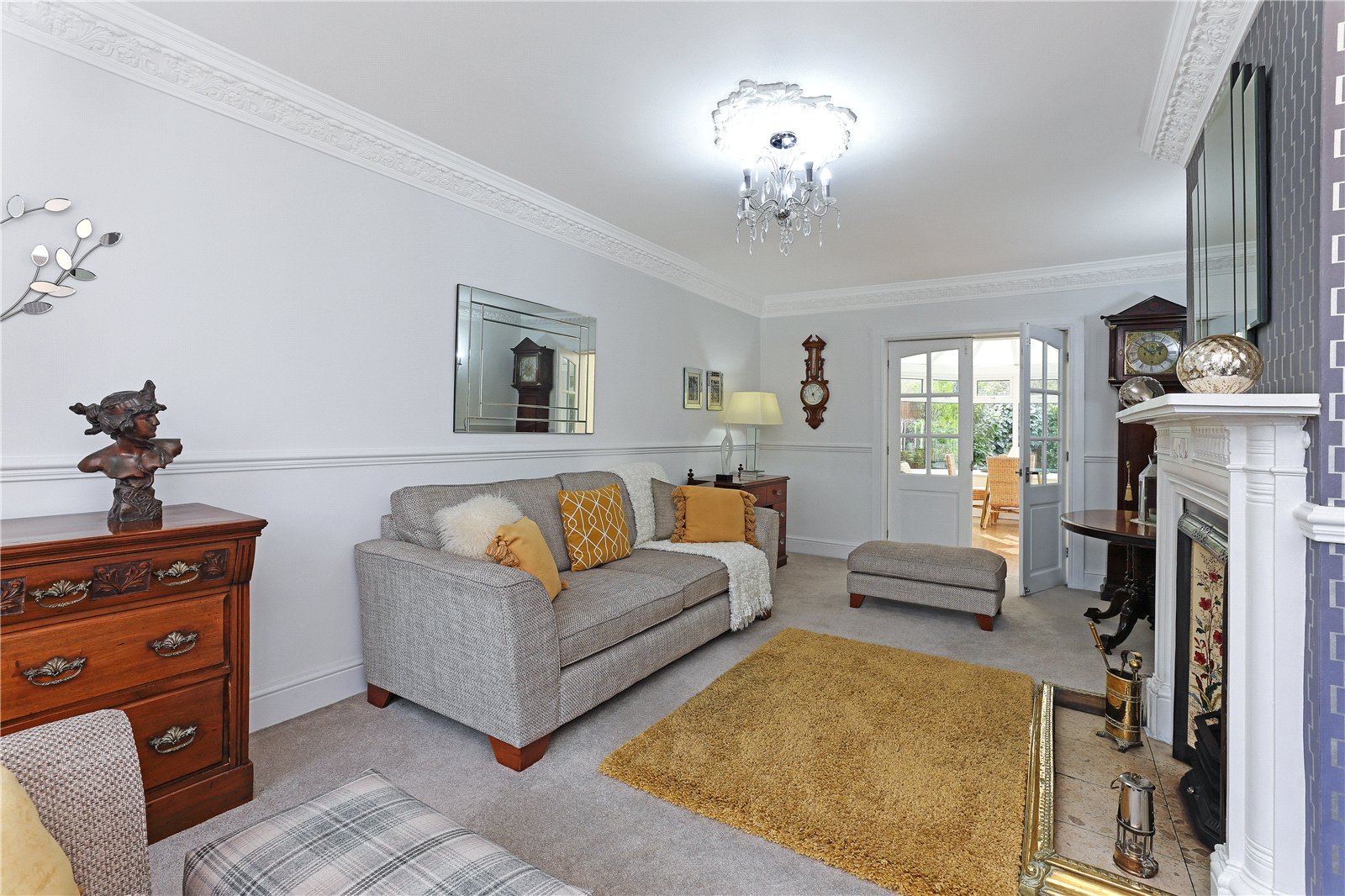 Living Room 20'1" x 11'3" (6.12m x 3.43m). With feature Adam style fire surround with cast iron inset, open grate, tiled hearth, two wall light points, double glazed bow window to the front, dado rail, single panel radiator, double doors opening to...