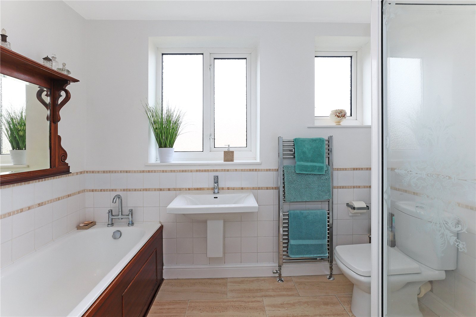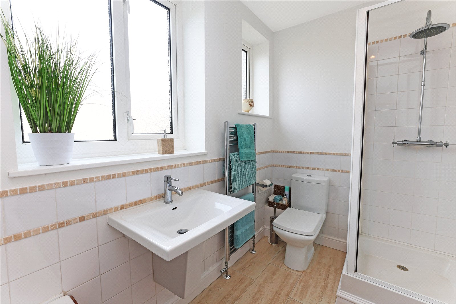 House Bathroom Furnished with modern white suite with wash hand basin, low flush w/c, panelled bath, separate shower cubicle, tiling, chrome heated towel rail, double glazed window.