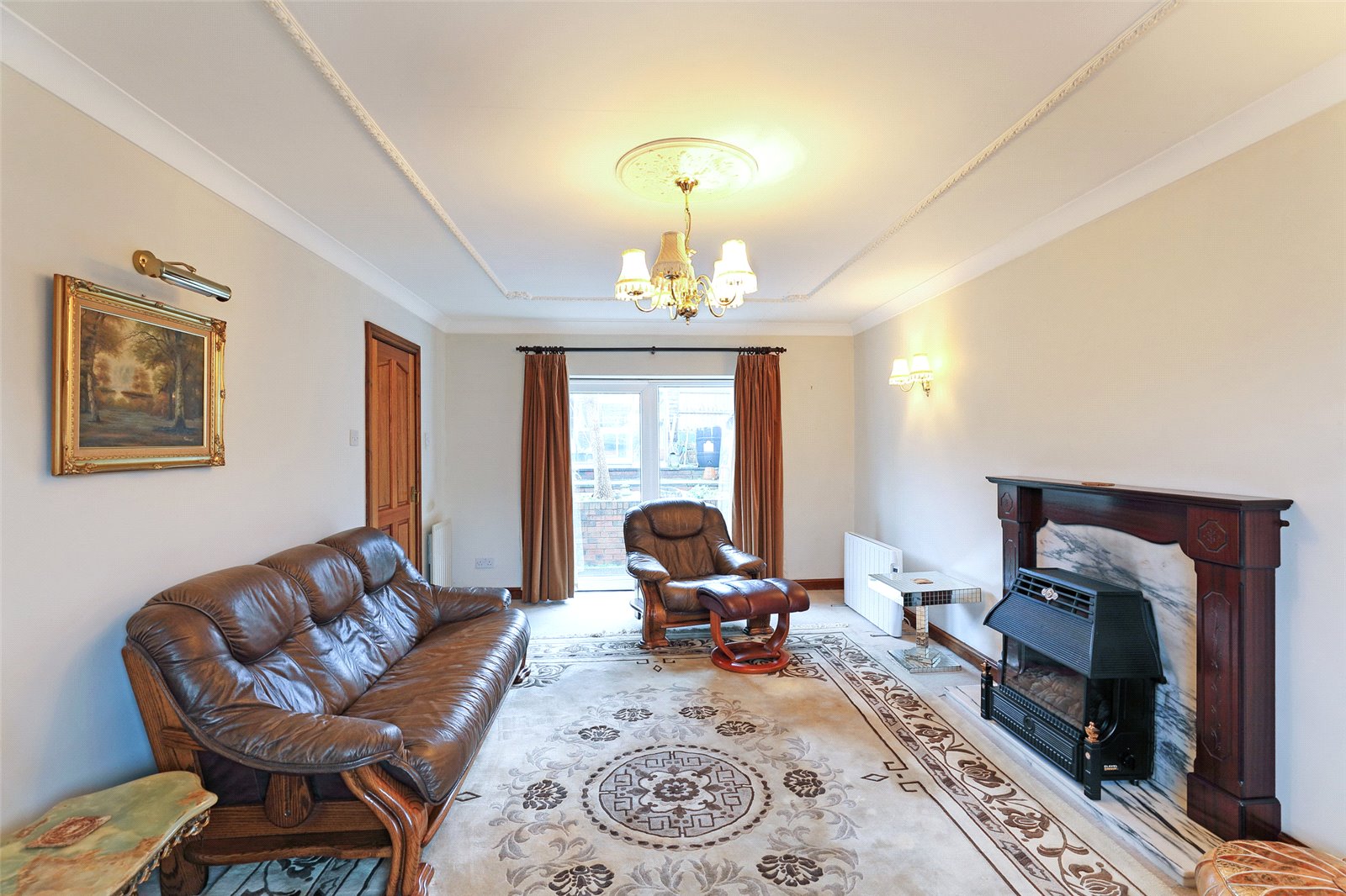 Through Living Room 19'3" x 11'9" (5.87m x 3.58m). With feature fire surround with marble inset, double glazed window to the front, sliding double glazed patio doors lead onto the rear garden, three wall light points, two single panel radiators.