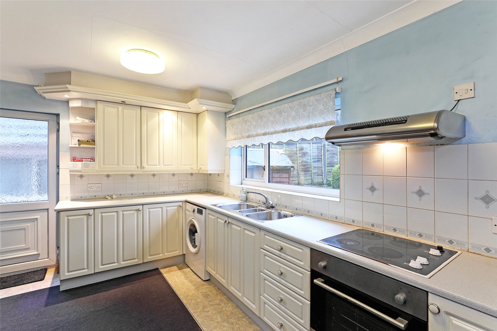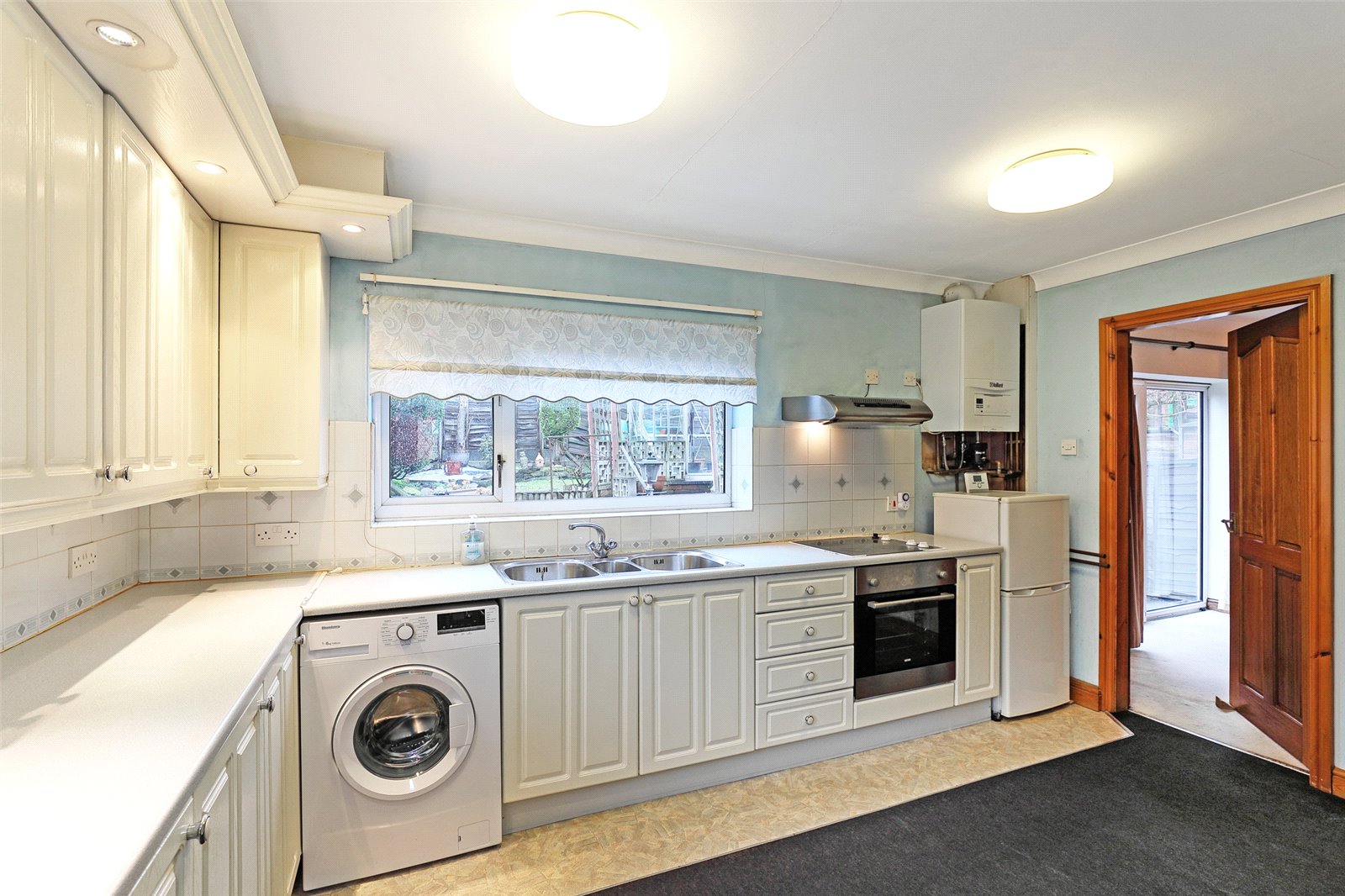 Breakfast Kitchen 13'11" x 9'9" (4.24m x 2.97m). Fitted with a matching range of white fronted wall and base units, contrasting worktop areas, stainless steel sink unit, with mixer tap unit, built in oven and hob with extractor hood over, Vaillant combination boiler, tiling between the worktops and wall units, double glazed window and rear entrance door, plumbing for automatic washing machine, understairs storage cupboard.