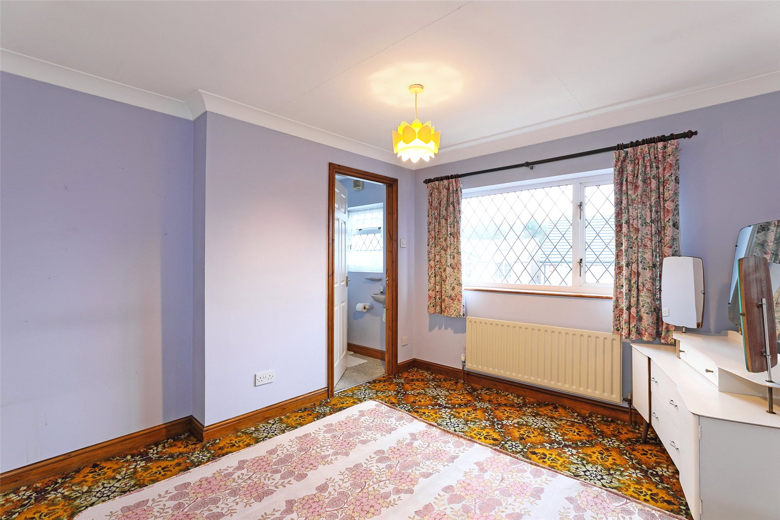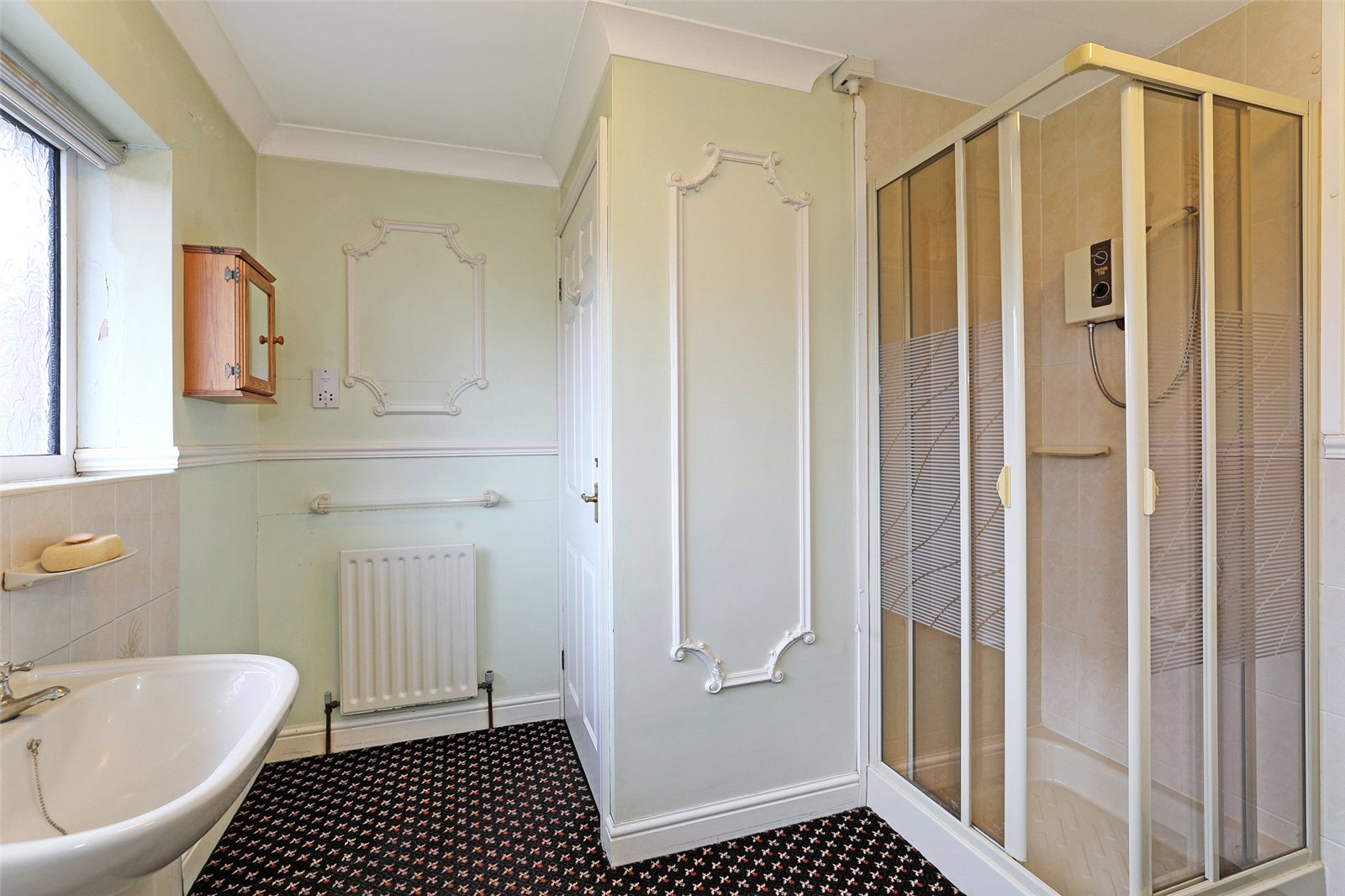 House Bathroom Furnished with coloured suite comprising pedestal wash basin, low flush w/c, corner bath, separate shower cubicle with electric shower, tiling, electric shaver point, double glazed window, single panel radiator.