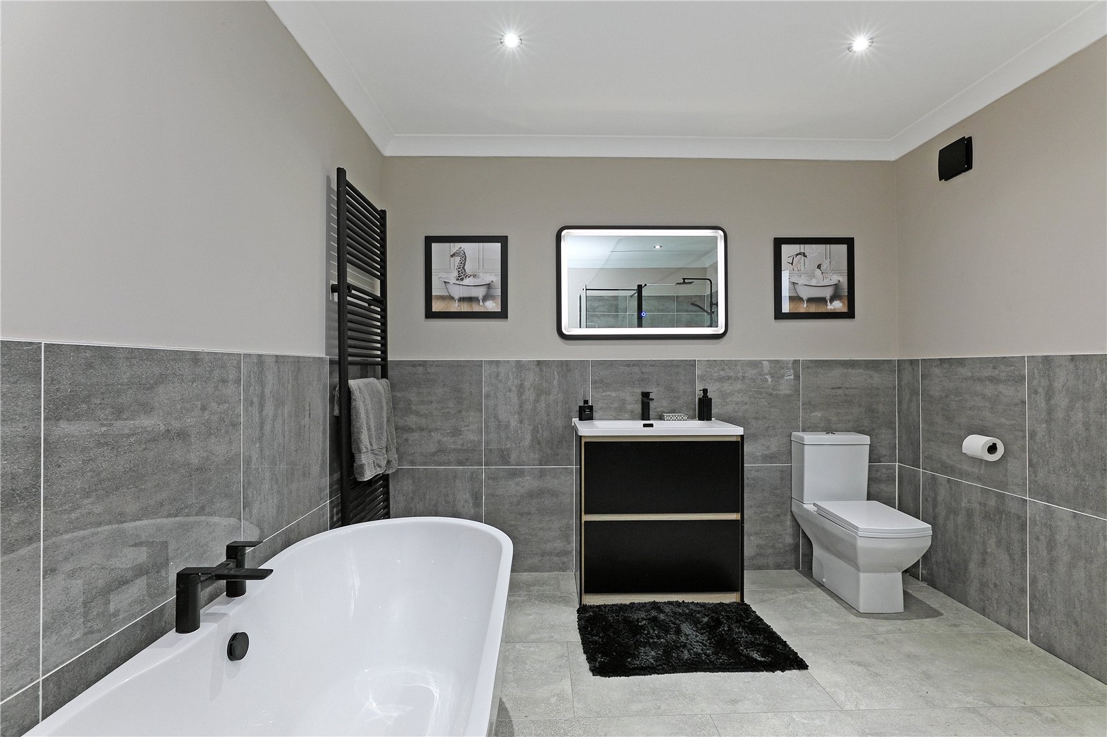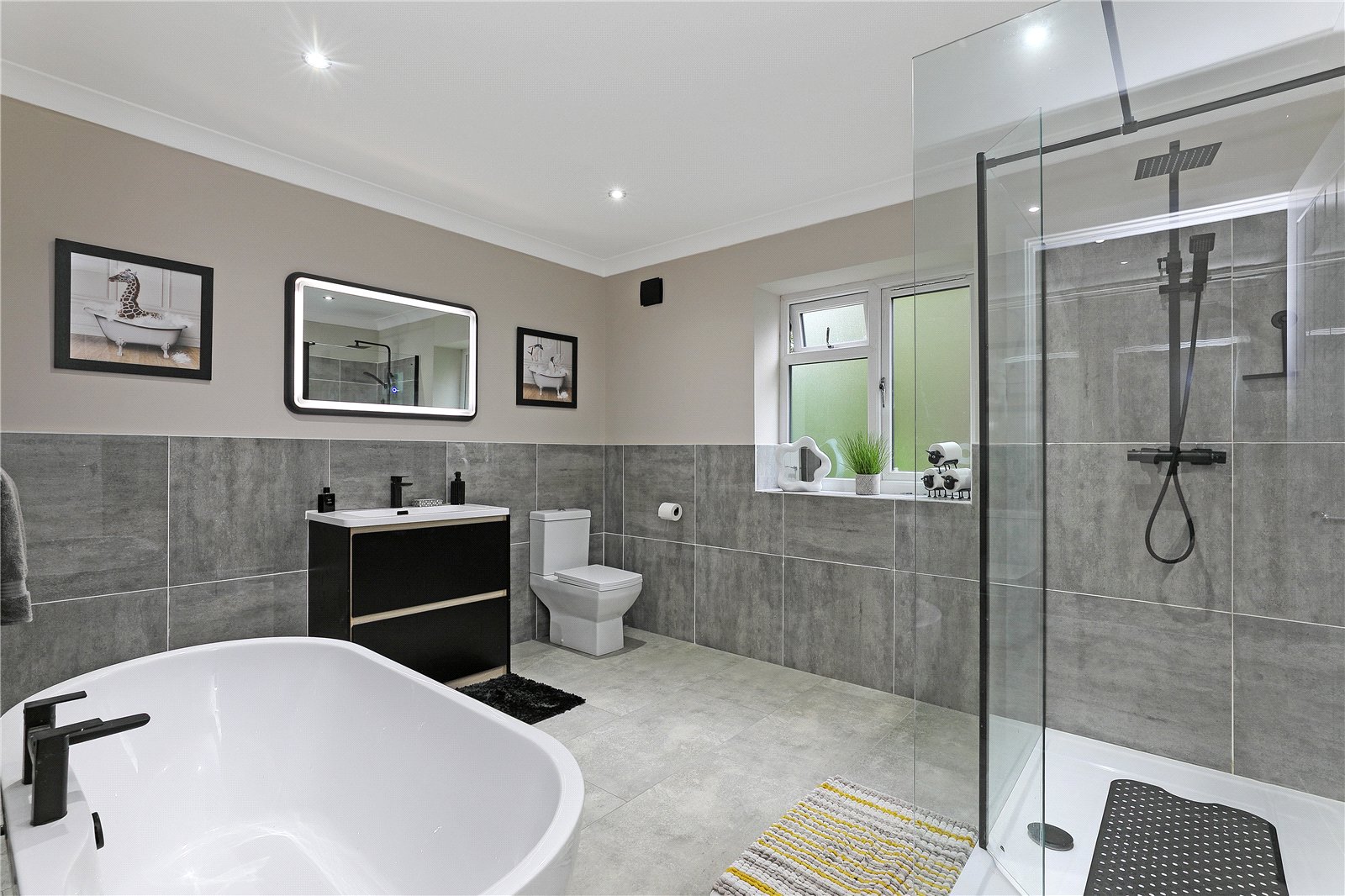 House Bathroom Furnished with contemporary white suite with feature matt black tap fitments with feature free standing tub bath, wash hand basin set in vanity unit, low flush w/c, large walk-in shower cubicle with Raindance shower head and attachment, feature vanity mirror, downlighting to the ceiling, half tiled walls, double glazed window, heated towel rail.