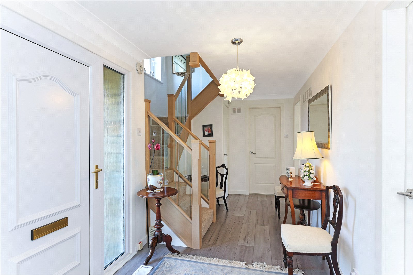 Reception Hallway With feature open staircase with glass balustrade with oak handrail, useful understairs storage, laminate wood flooring.