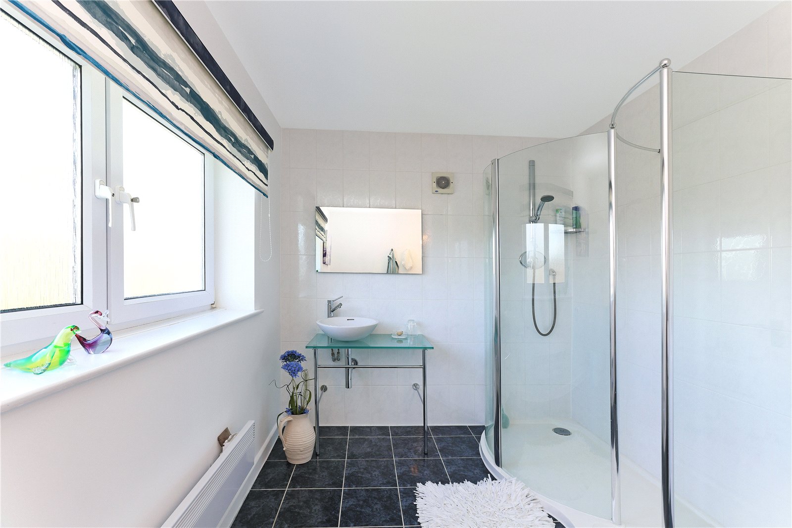 Ensuite Shower Room Furnished with modern white suite comprising pedestal wash basin, low flush w/c, walk-in shower, tiled floor, double glazed window.