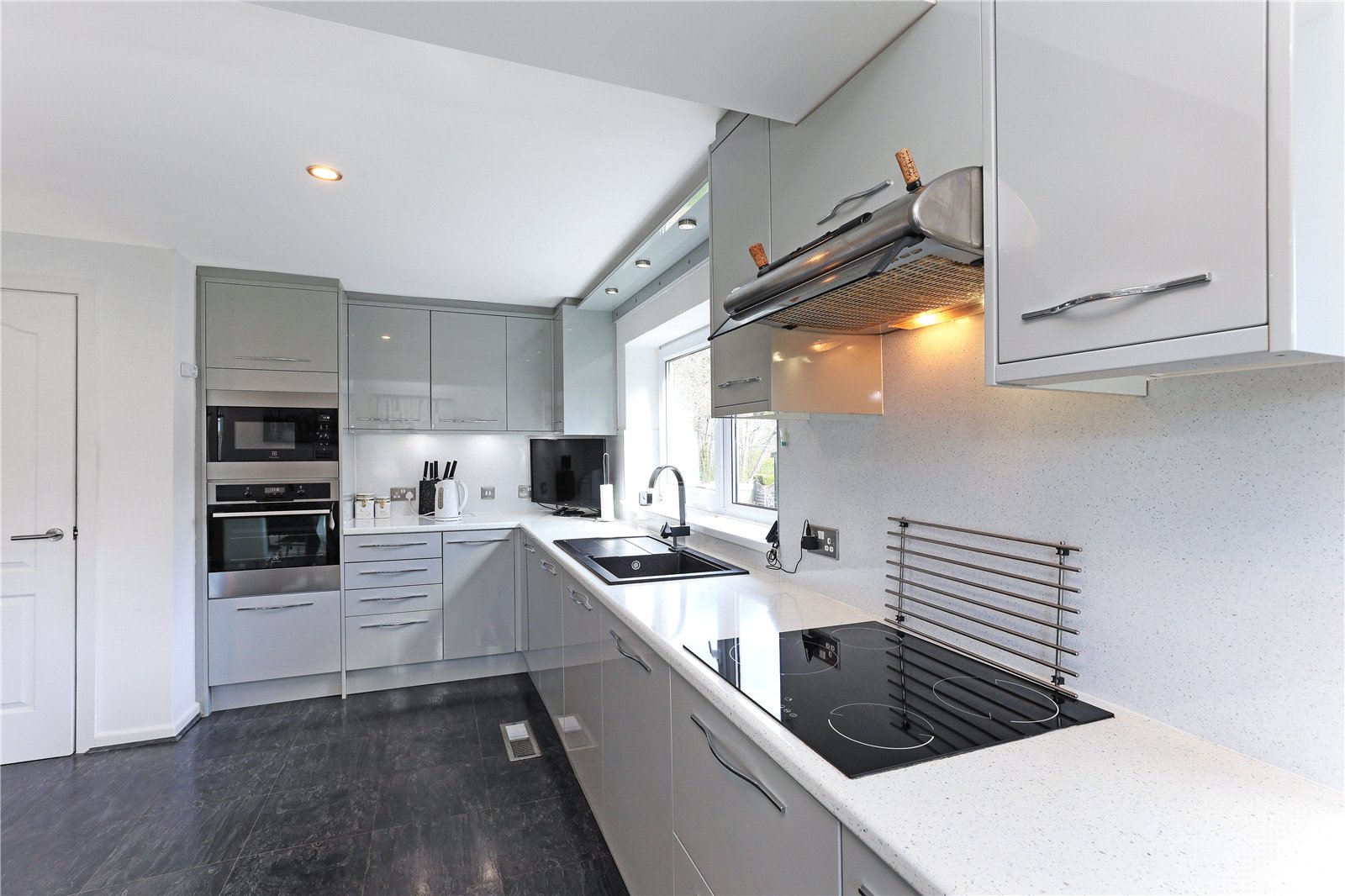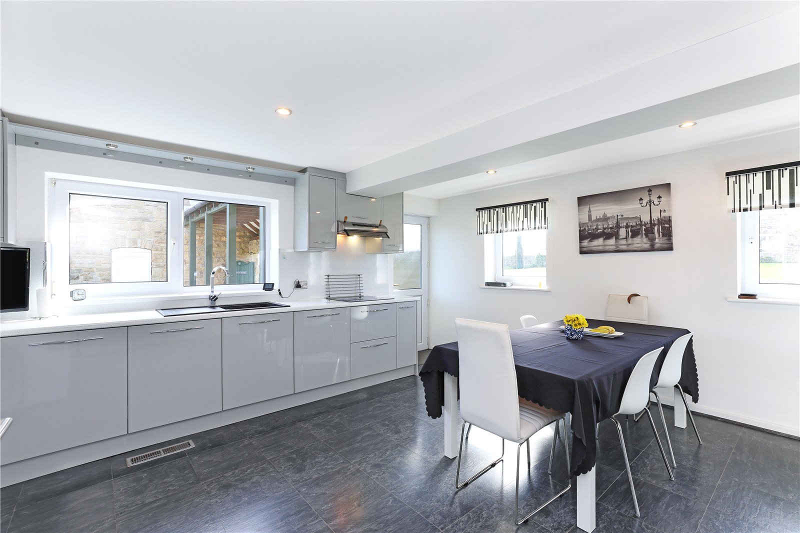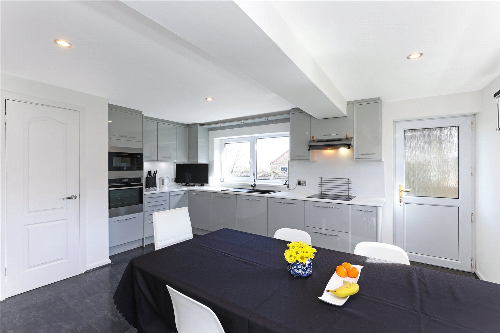 Breakfast Kitchen 13'11" x 16'4" (4.24m x 4.98m). Well appointed with a range of high gloss fronted wall and base units, contrasting high gloss worktops, sink unit with drainer and mixer tap, integrated oven, microwave, dishwasher, hob with extractor hood over, tiling between the worktops and wall units, dual aspect double glazed windows makes this a light and airy room, downlighting to the ceiling, double glazed rear entrance door.