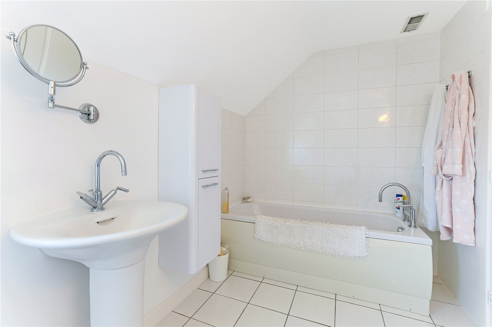House Bathroom Furnished with modern white suite with pedestal wash basin, low flush w/c, panelled bath, tiling, double glazed window.