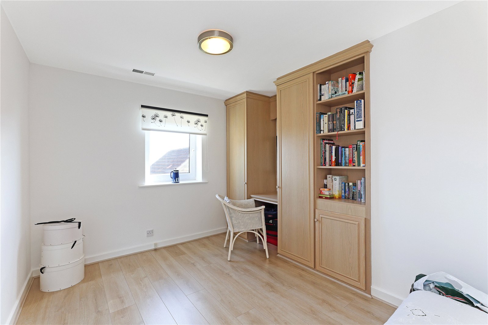 Bedroom to Rear 10'7" x 10'3" (3.23m x 3.12m). With fitted wardrobes, laminate wood flooring, double glazed windows, feature shelving, open views.