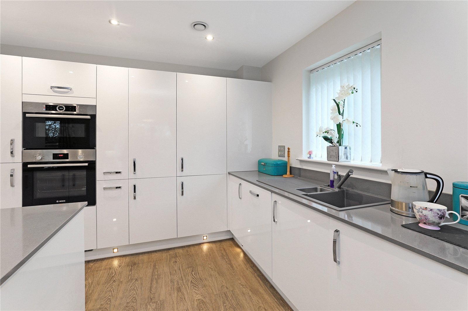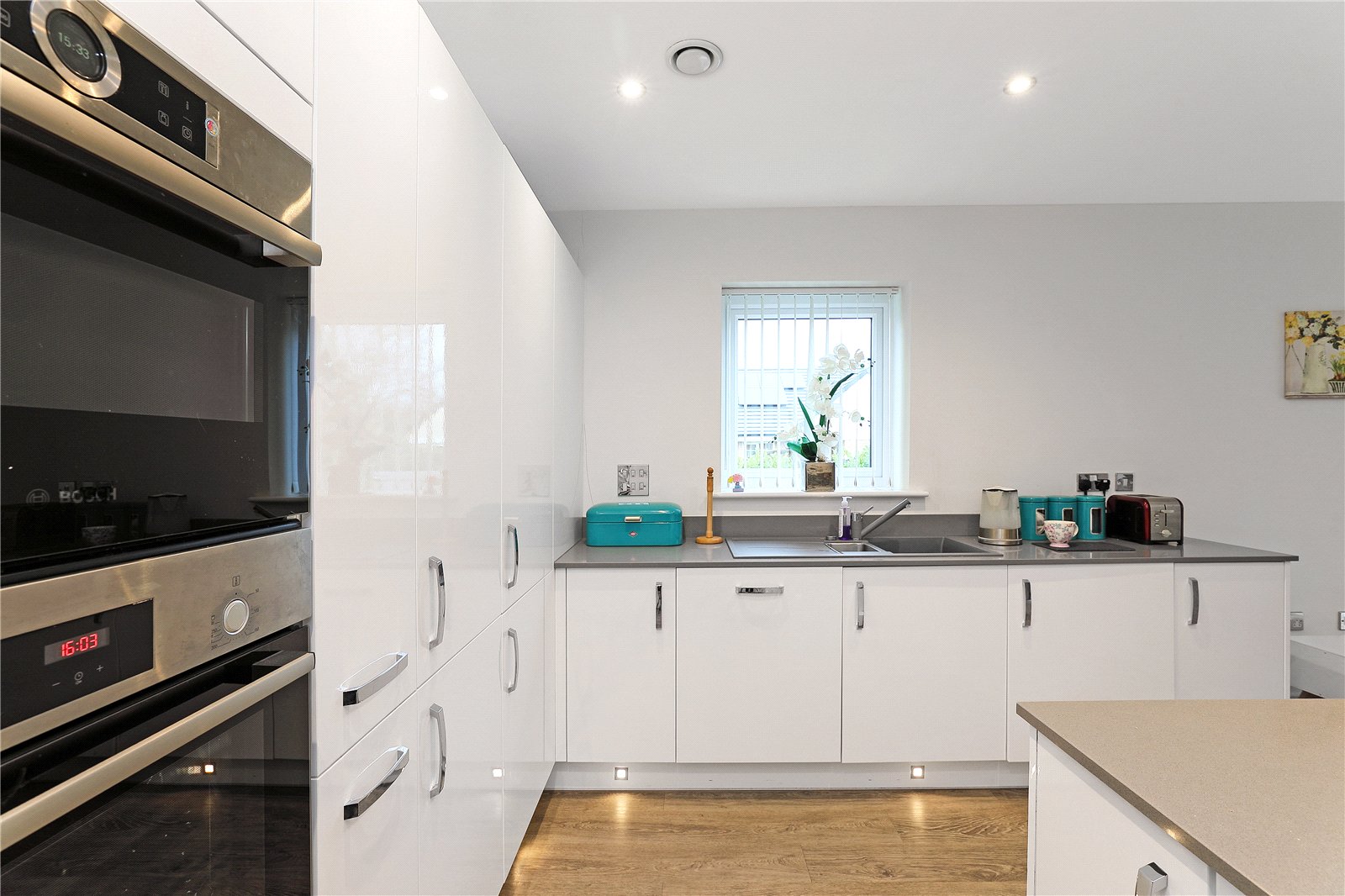 Kitchen Area, comprehensively well fitted with a range of high gloss white fronted wall and base units, contrasting worktop areas, colour co-ordinated sink unit, monobloc tap fitment, built in double oven, hob with extractor hood over, integrated dishwasher, fridge and freezer, washer dryer.