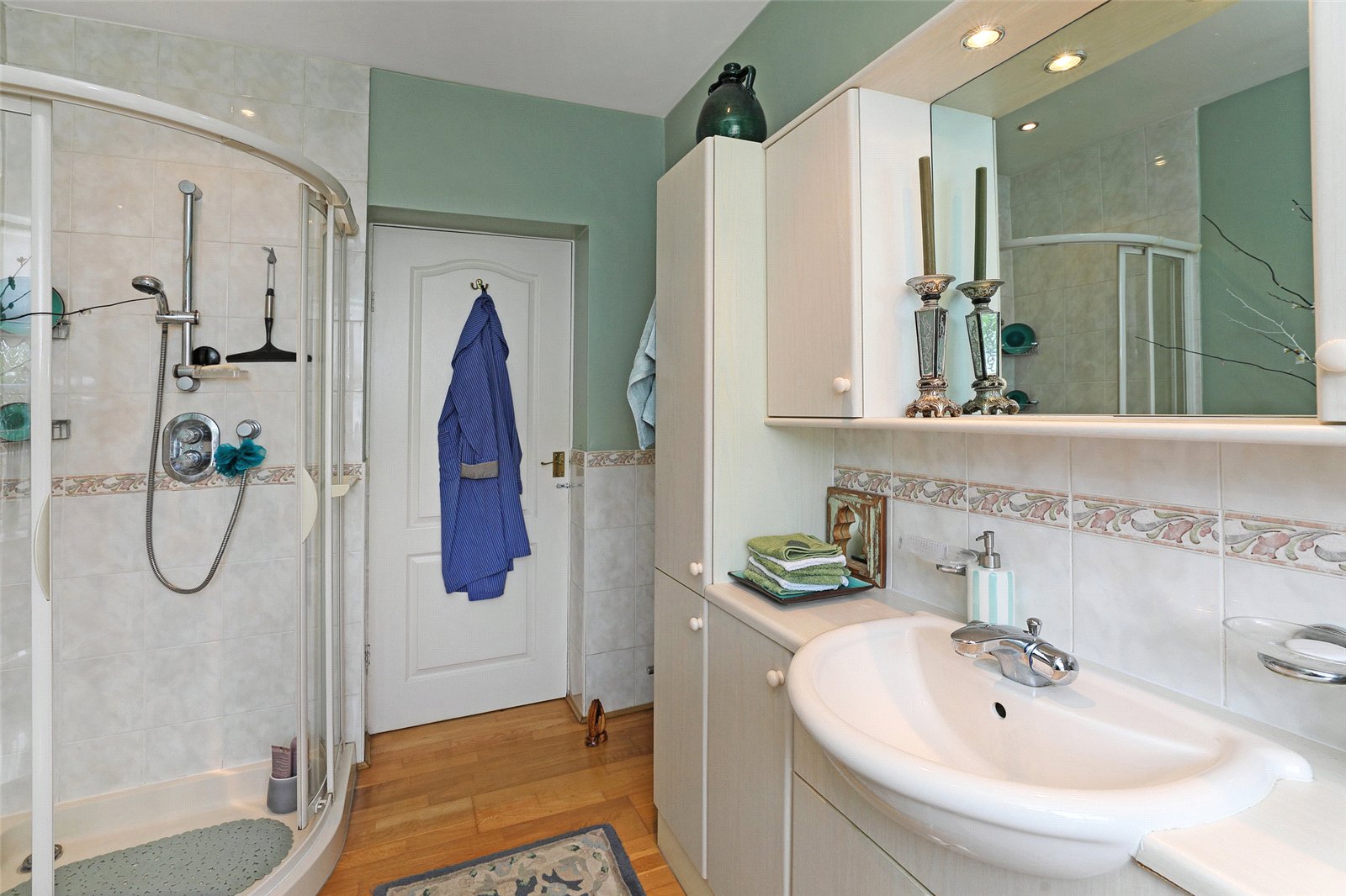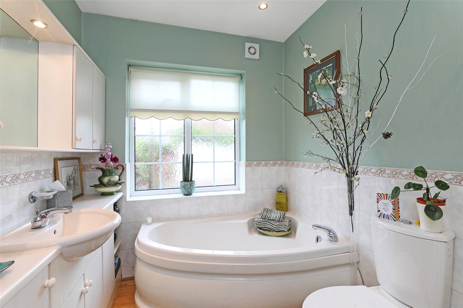 House Bathroom Furnished with modern white suite with wash hand basin set in vanity unit, low flush w/c, corner bath, separate corner shower, tiling, double glazed window, chrome heated towel rail.