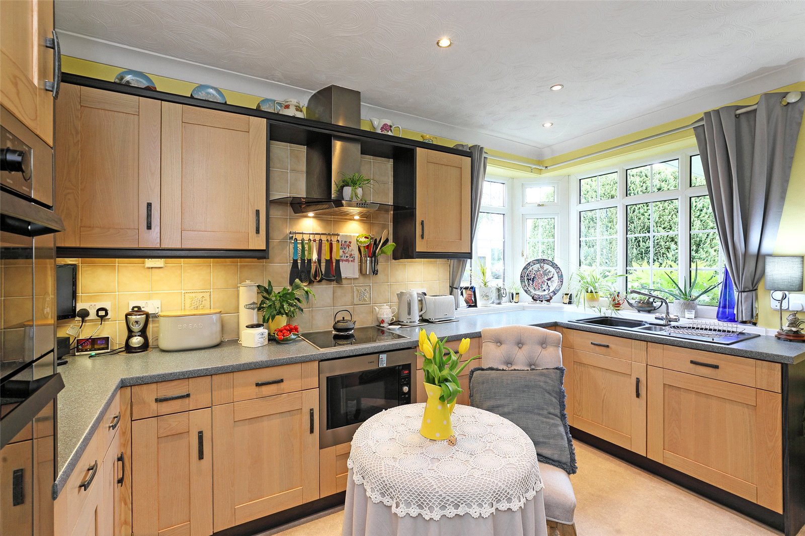Breakfast Kitchen 12'11" x 9'10" (3.94m x 3m). Fitted with a matching range of light oak shaker style fronted wall and base units, contrasting worktop areas with colour co-ordinated sink unit, monobloc tap fitment, built in double oven, microwave, hob and extractor hood over, integrated dishwasher, tiling between the worktops and wall units, feature double glazed corner window again makes this a light and airy room.