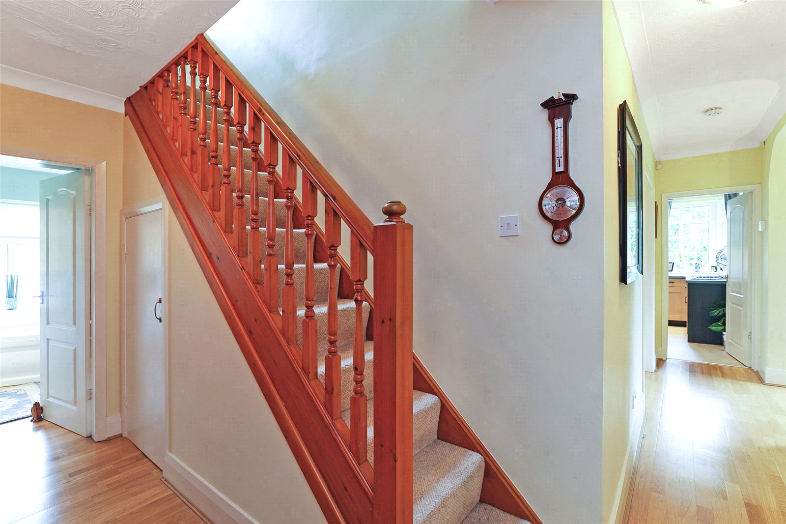 Reception Hallway With laminate wood flooring, open staircase, double panel radiator.
