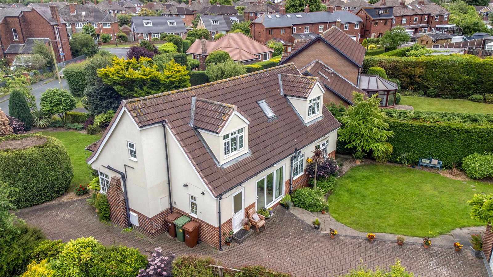Holroyd Miller have pleasure in offering for sale this unique and indivdually designed detached dormer bungalow offering flexible living accommodation for the family or those wishing to downsize with well proportioned accommodation throughout and occupying a generous private plot with detached double garage. The accommodation has both gas fired central heating and PVCu double glazing and comprising entrance porch leading to reception hallway with spacious living room with feature fireplace, feature corner window, double doors from the hallway lead through to large formal dining/sitting room with patio doors leading onto the rear garden, well equipped breakfast kitchen with integrated appliances, adjacent utility room, home office/bedroom four, ground floor bedroom with adjacent house bathroom. To the first floor, two double bedrooms both having ensuites with eaves storage and built in wardrobes. Outside, the property occupies a generous and private plot with mature trees and shrubs, block paved driveway to the side leads to the rear with large detached double garage, further lawn garden with stone paved patio area. A truly enviable home located in the popular area of Durkar south of Wakefield city centre within easy reach of local schools and amenities and access to J39/M1 ideal for those travelling to either Leeds or Sheffield.