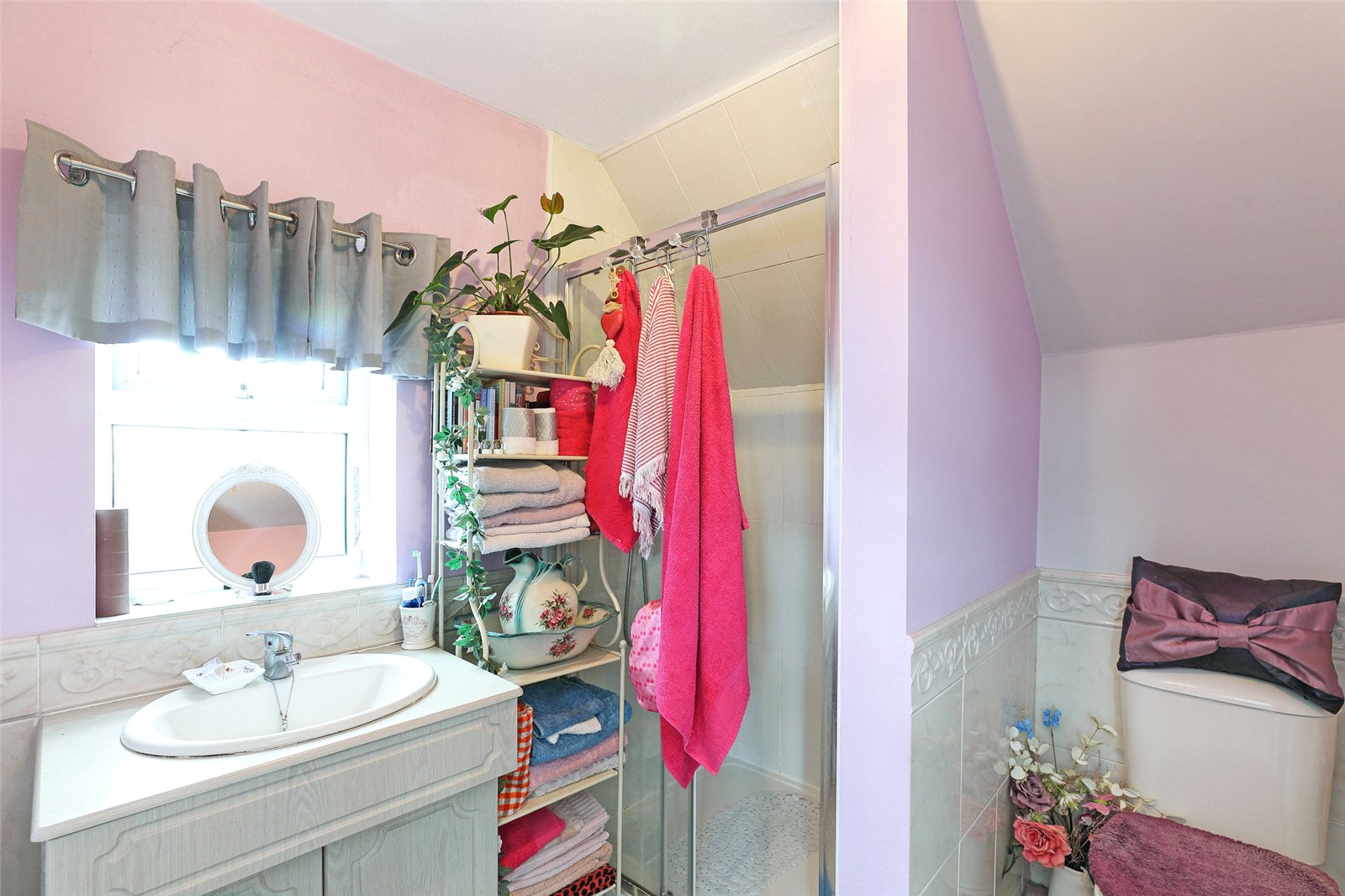 Ensuite Shower Room Having wash hand basin, wc, shower cubicle, tiling, double glazed window, chrome heated towel rail.