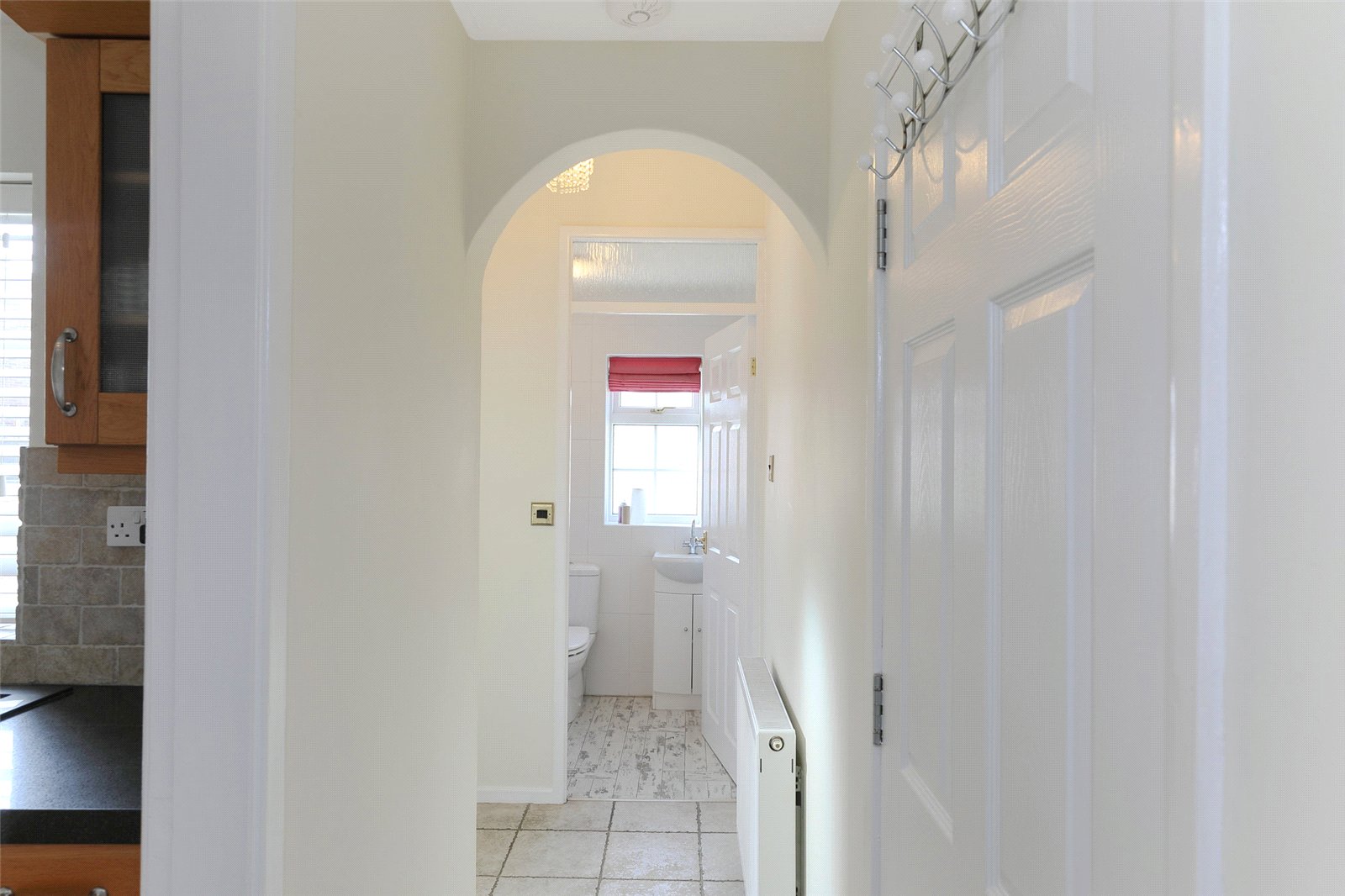 Cloakroom Having wash hand basin set in vanity unit, low flush w/c, tiling, double glazed window, chrome heated towel rail.