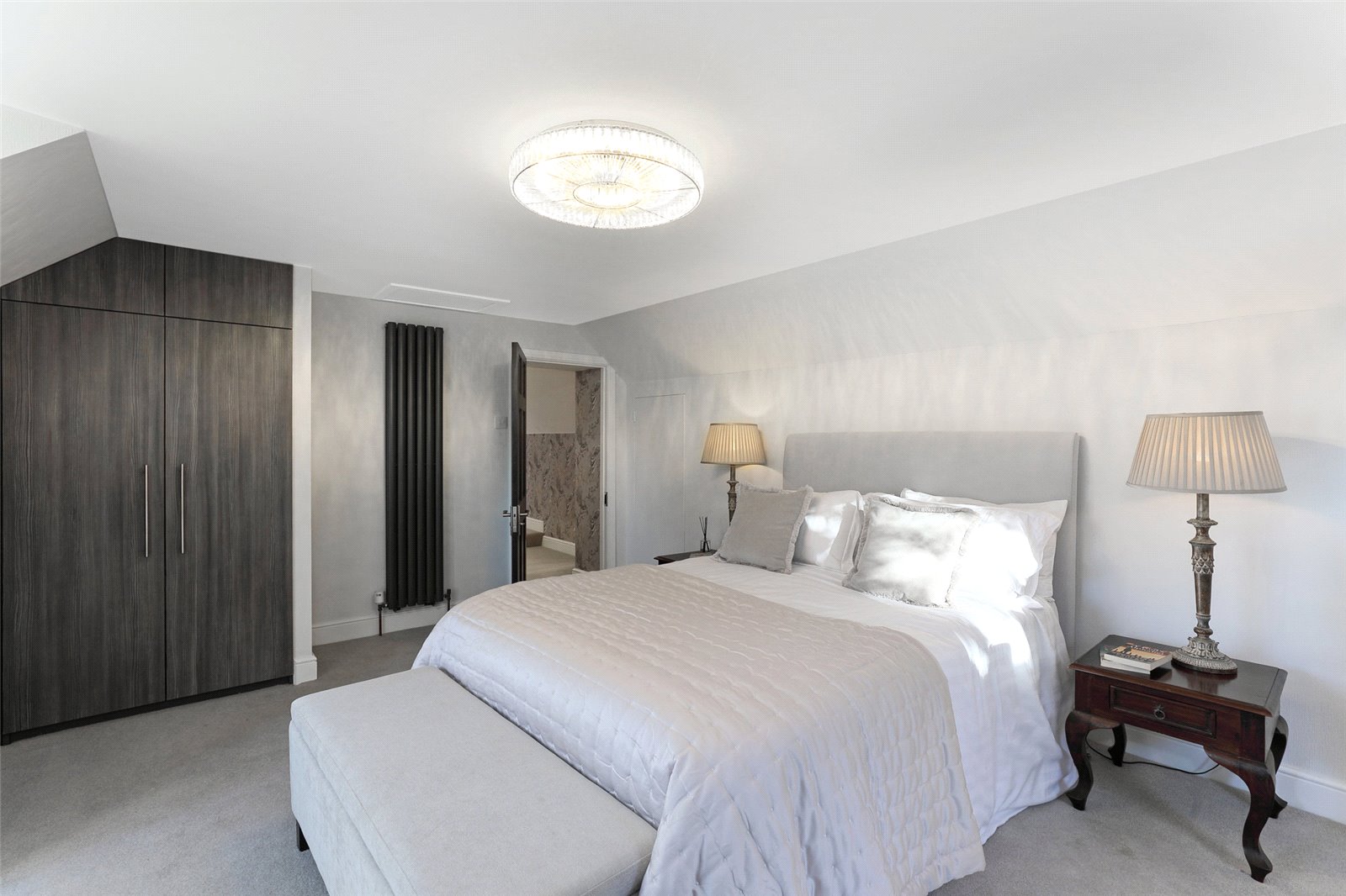 Bedroom 17'5" x 16'1" (5.3m x 4.9m). Having two sets of L-shaped fitted wardrobes, a single window and double windows overlook the front garden., The room includes a feature radiator and under-eaves storage via a flush door and lighting.