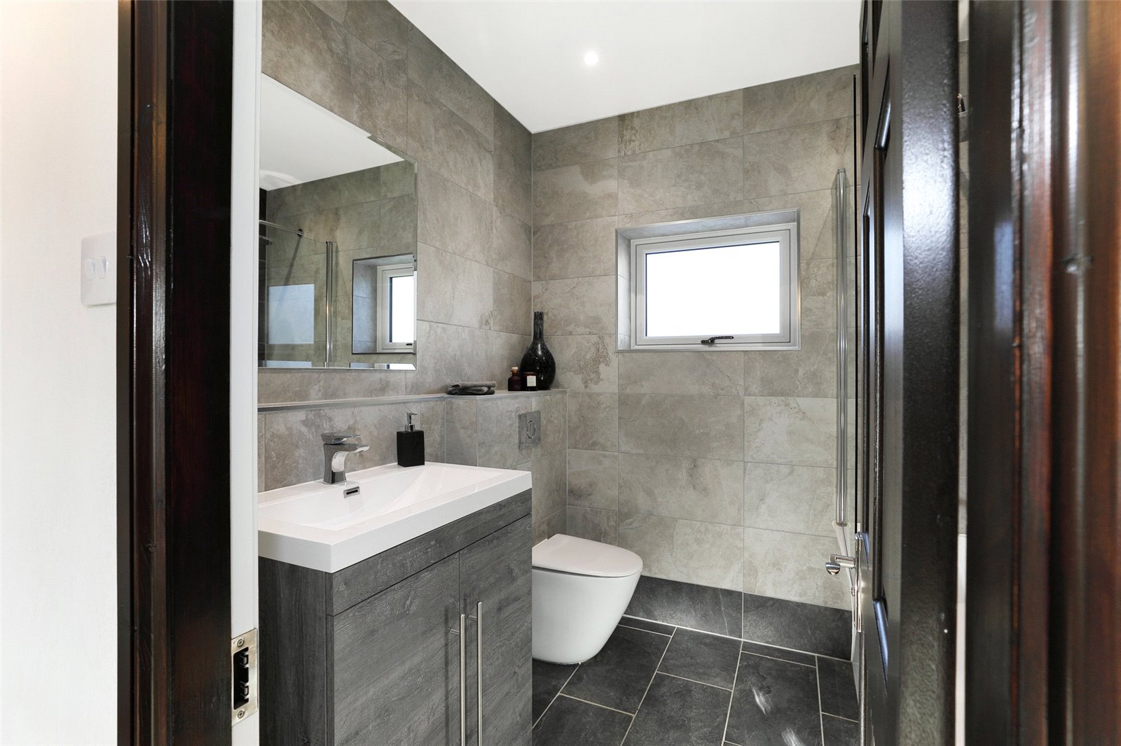 Bathroom 6'8" x 7'3" (2.03m x 2.2m). Another bathroom furnished with a contemporary style suite of wash hand basin, low flush w/c, panelled bath and shower over. Full height tiling, single window and heated towel rail.