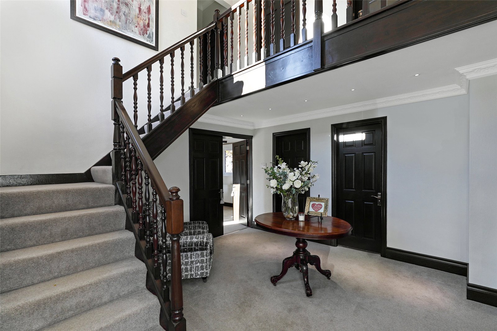 Reception Hallway 13'10" x 12'6" (4.22m x 3.8m). With bespoke arched entrance door, spindled staircase and galleried landing, understair storage cupboard, central chandelier and wall-mounted picture lights. This is a grand entrance to the home.