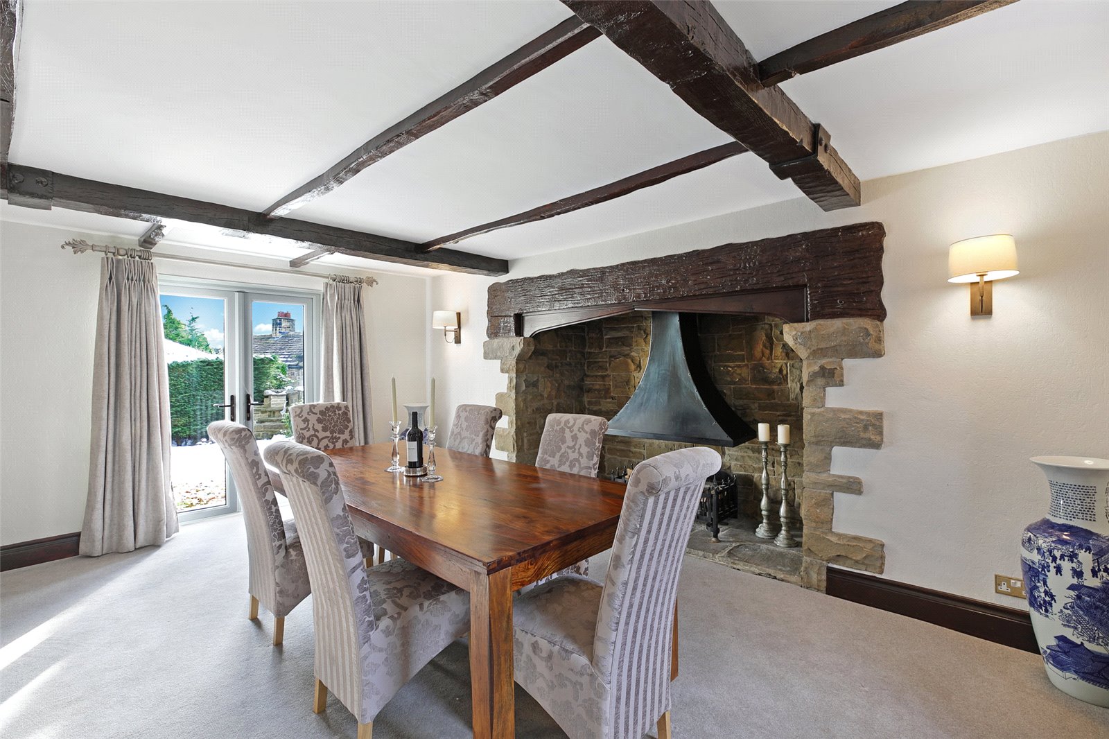 Dining Room 17'6" x 13' (5.33m x 3.96m). With access via double doors from the hall. Mullioned windows to rear, exposed beam ceiling, feature stone inglenook style fireplace and grate, four wall light / picture light points. French doors lead to the front garden. This room lends a traditional feel to this section of the house.