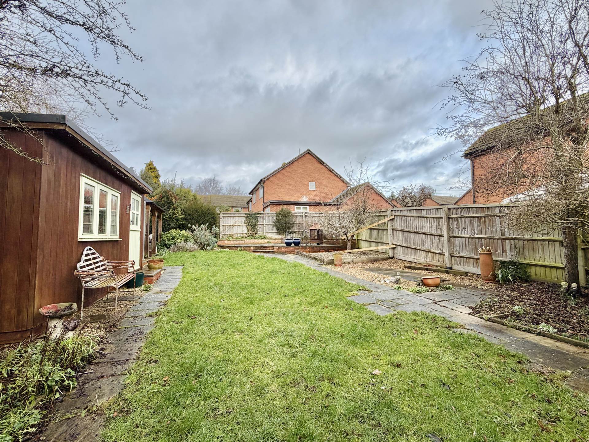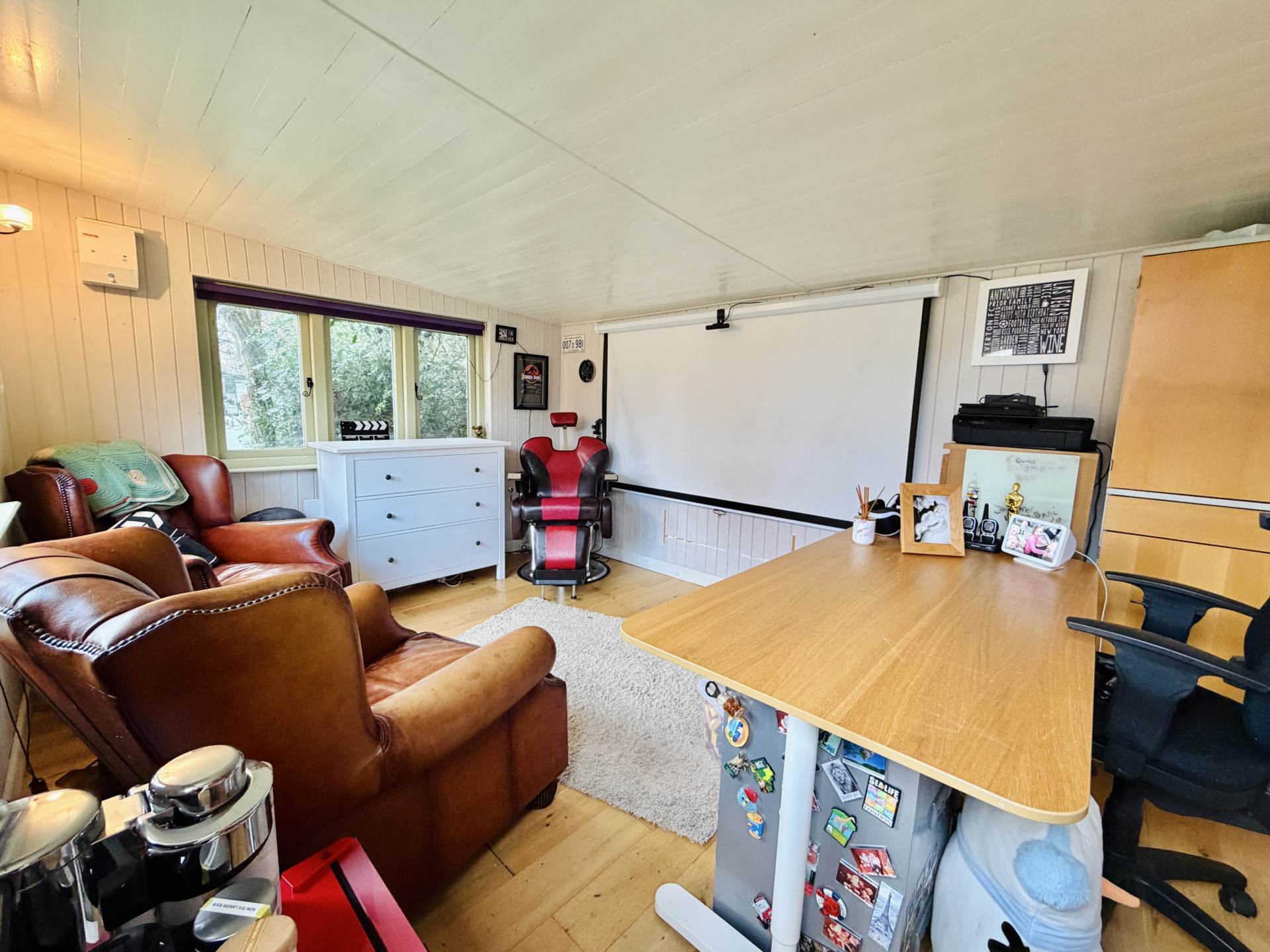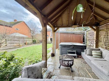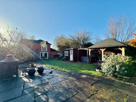 To the front, there is driveway parking and gated side access leading to the mature rear gardens. Generous in size and thoughtfully arranged, the outdoor space includes a large patio area, pergola, hot tub, summer house an excellent setting for entertaining, relaxing or family play. The garage was converted leaving a handy store room to the front. There is also a large timber build garden shed.