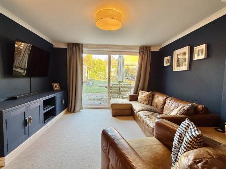 The accommodation includes a porch, entrance hallway, and a contemporary kitchen/breakfast room featuring quartz work surfaces and integrated appliances. The spacious lounge/dining room opens directly onto the rear garden via sliding doors, complemented by a separate family room and a dedicated play room perfect for those needing additional space for work or leisure. A ground floor shower room adds further practicality.