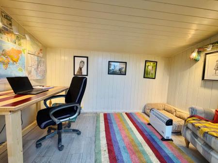 Accommodation includes an entrance hall, cloakroom, 29` living/dining room with wood burner, 17` re-fitted kitchen breakfast room with integrated appliances. Upstairs are two double bedrooms and superb family bathroom with separate shower and bath. The rear garden is west facing and over 100 feet in length divided between lawn and decking. There are two outbuildings comprising of a bespoke home office with light, power and Internet and a studio and workshop, again with light and power. To the front of the house is driveway parking for two cars and side access gate leading to the rear.