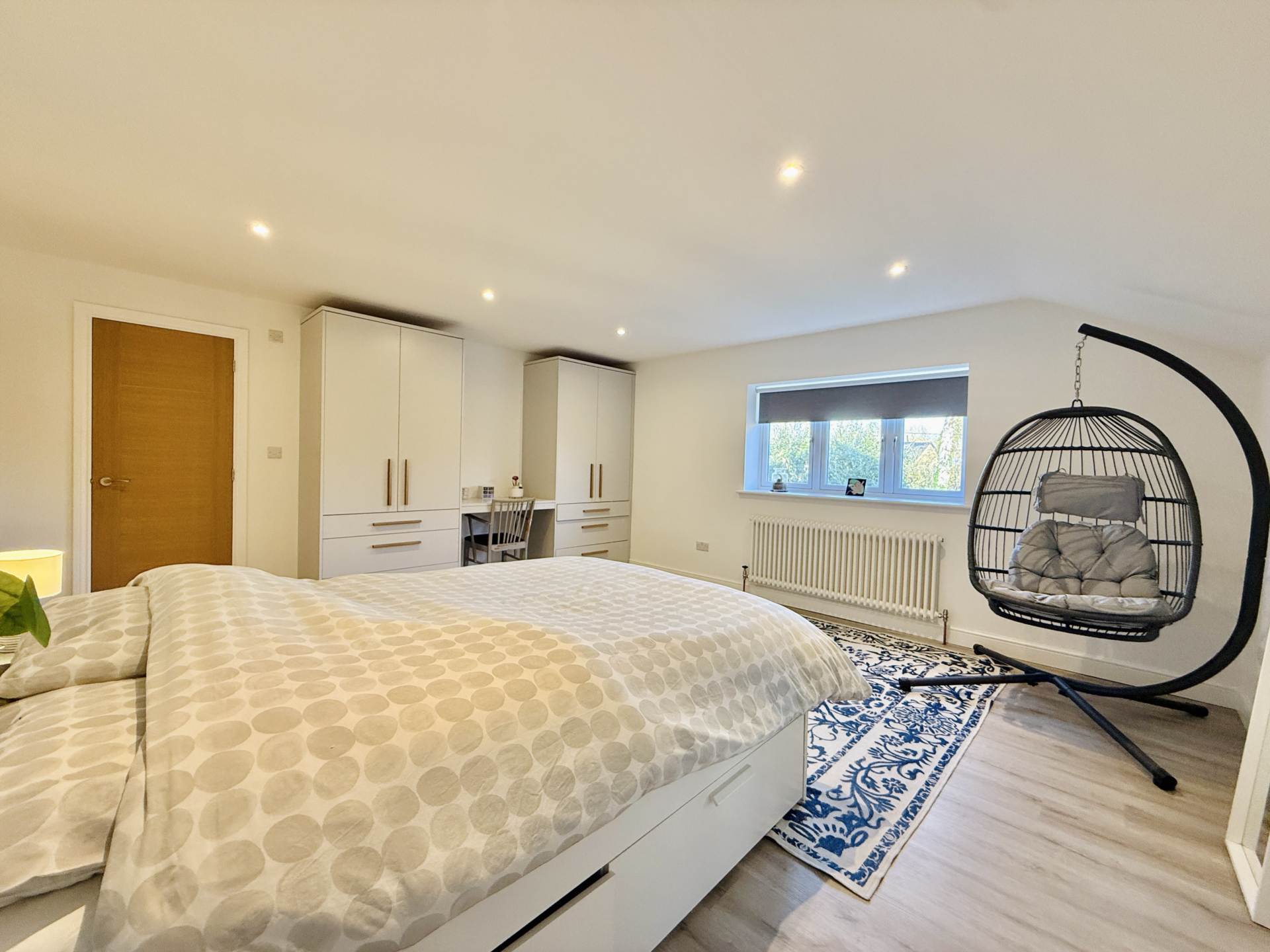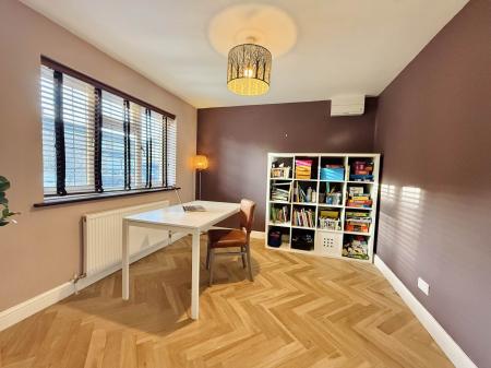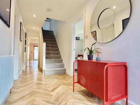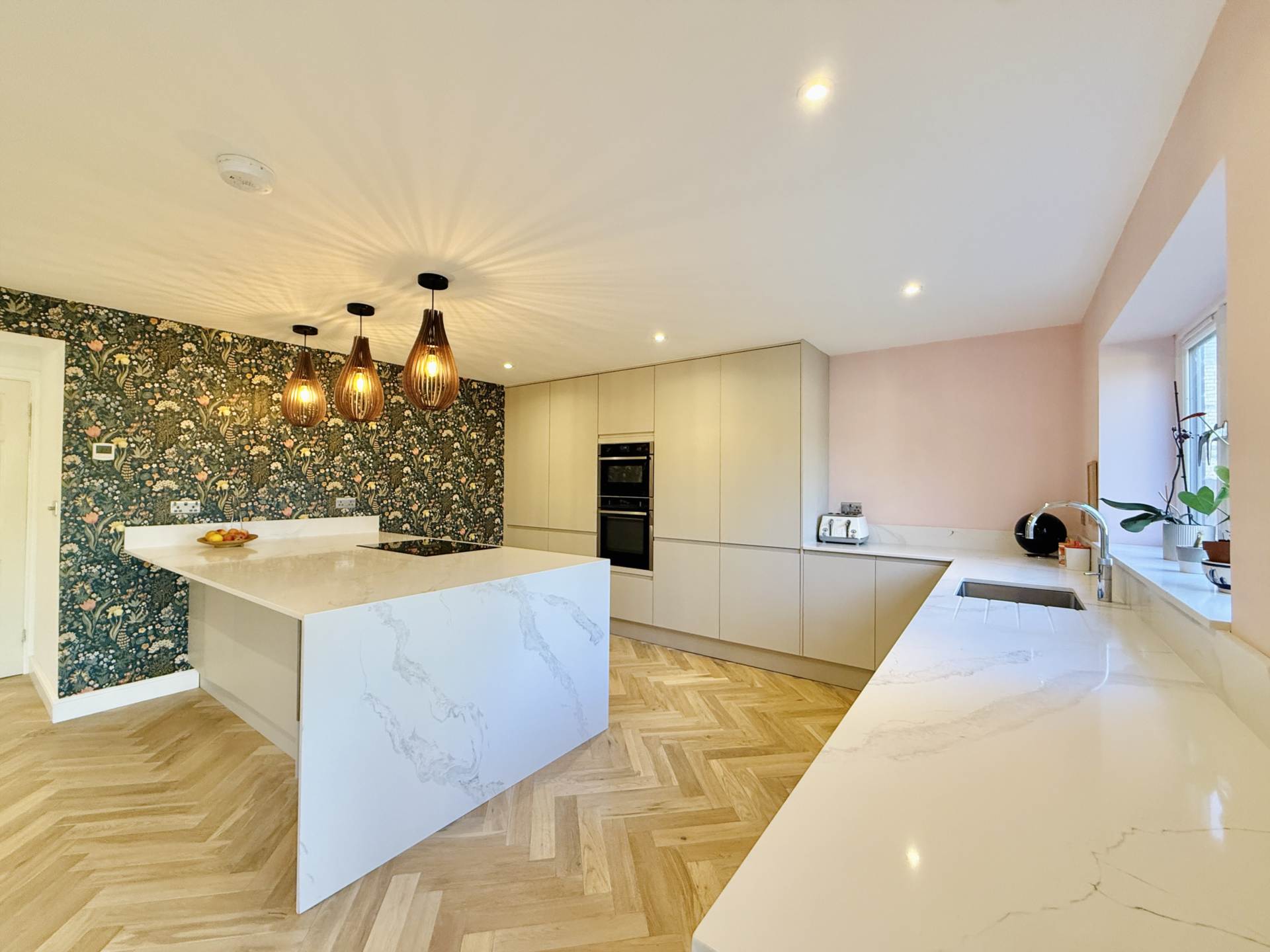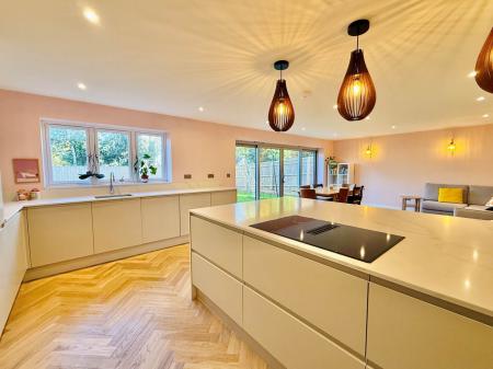 Beyond the scale of accommodation, the kitchen is a standout feature. Fully integrated and finished with quartz work surfaces, it incorporates a substantial central island and enjoys sliding doors opening directly onto the rear garden. The ground floor benefits from stylish herringbone flooring throughout, underfloor heating to the kitchen/dining/family room, full uPVC double glazing, newly installed central heating and upgraded electrics.