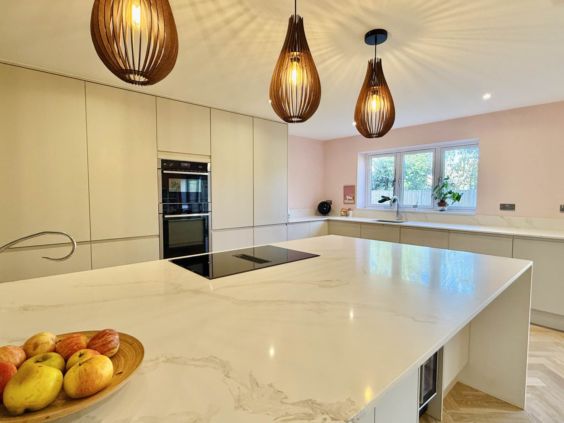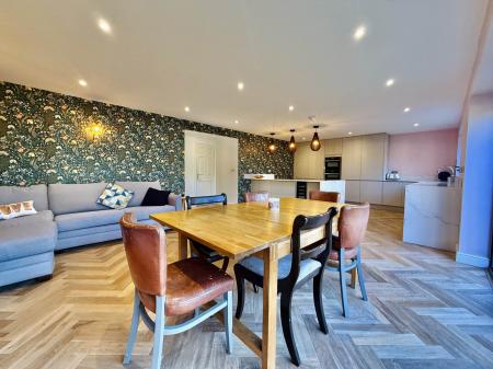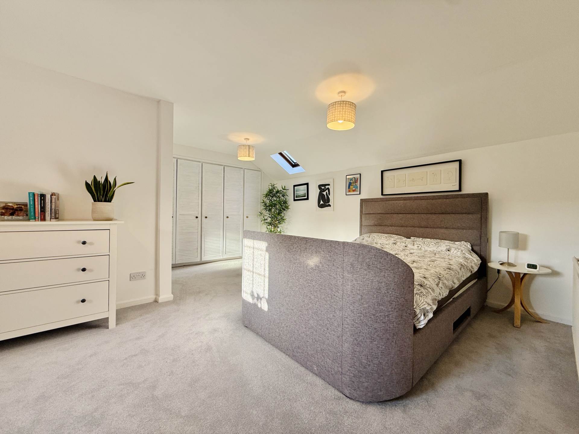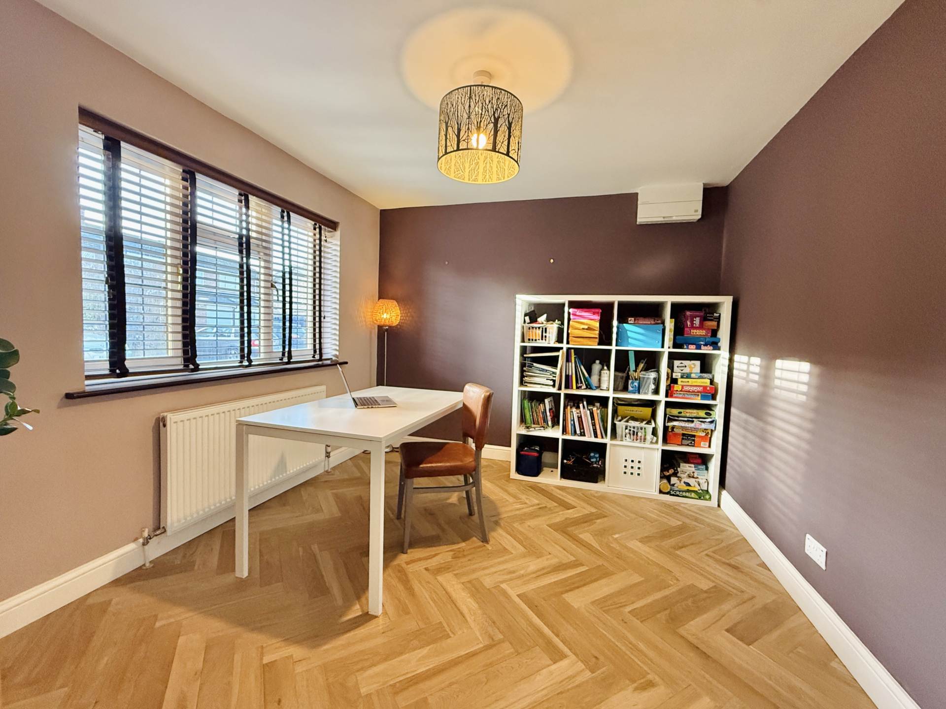 Beyond the scale of accommodation, the kitchen is a standout feature. Fully integrated and finished with quartz work surfaces, it incorporates a substantial central island and enjoys sliding doors opening directly onto the rear garden. The ground floor benefits from stylish herringbone flooring throughout, underfloor heating to the kitchen/dining/family room, full uPVC double glazing, newly installed central heating and upgraded electrics.