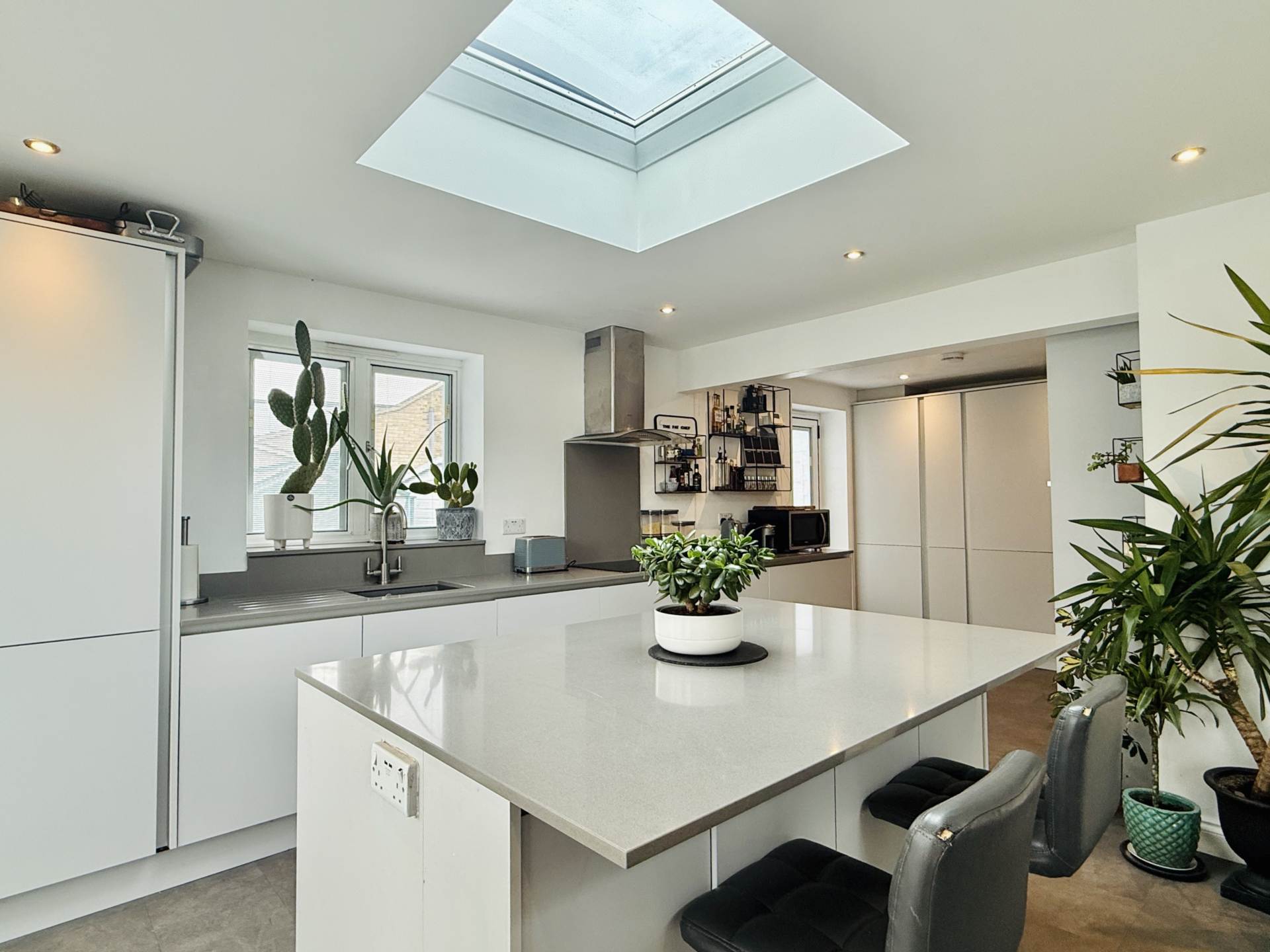 The property has been thoughtfully extended to the rear, creating generous open-plan living spaces, while also benefiting from a landscaped south-facing garden, a versatile garden office, and ample driveway parking.