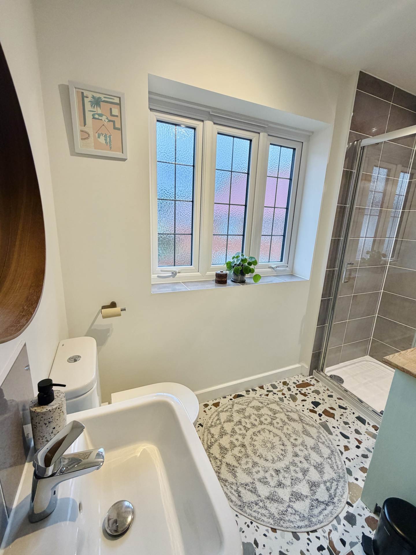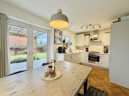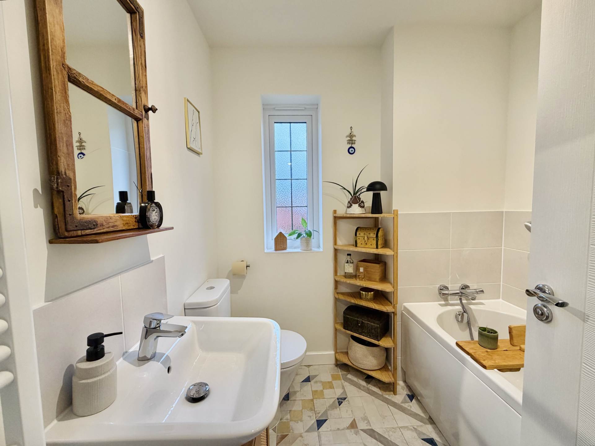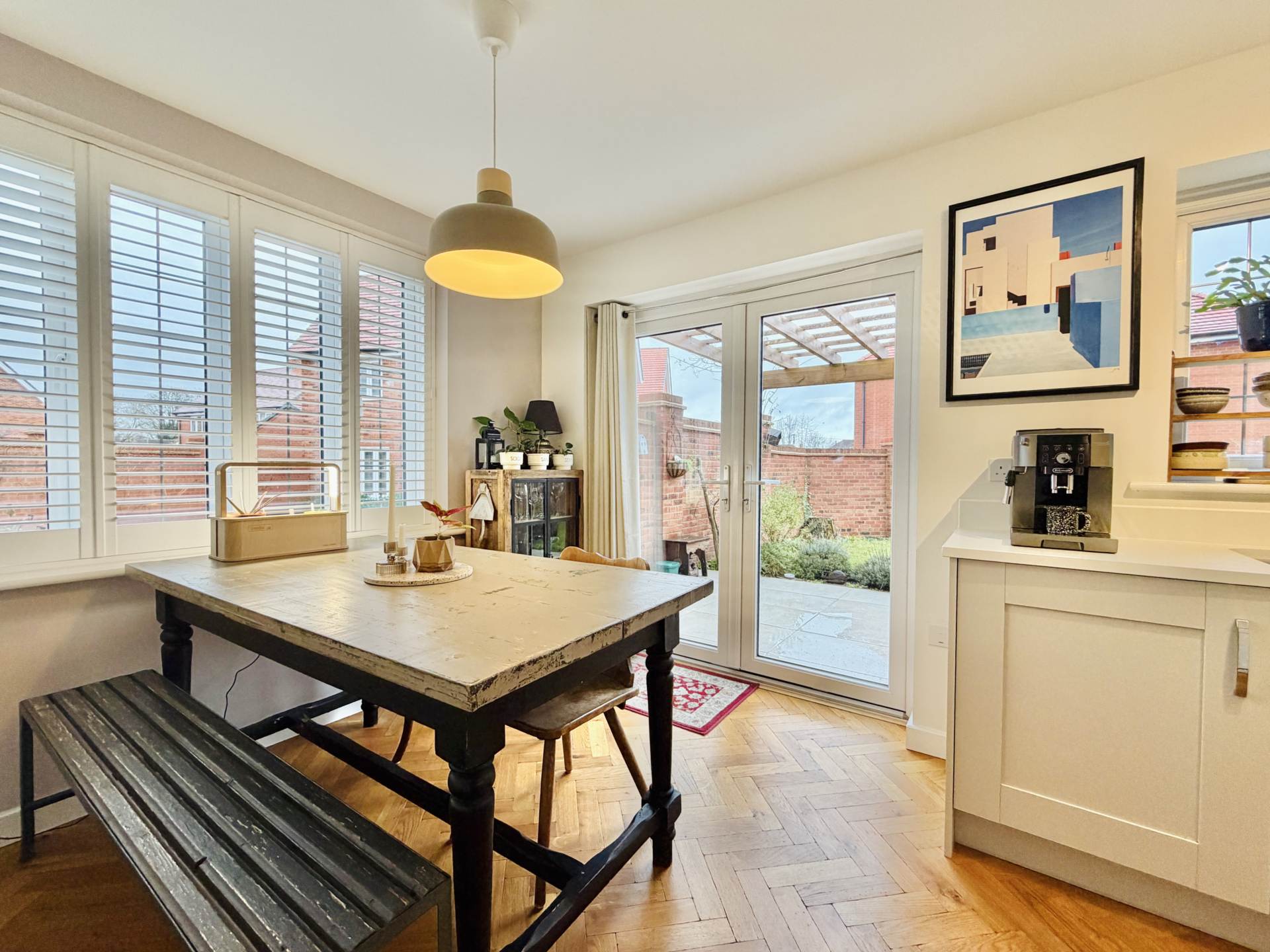 The house opens into a generous entrance hall with cloakroom and useful under-stairs storage. From here, the accommodation flows effortlessly into a fully integrated, dual-aspect kitchen/diner, the natural heart of the home, complete with French doors opening directly onto the garden. The dual-aspect sitting room is light and inviting, while upstairs there are three well-balanced bedrooms, a modern family bathroom and a smart en-suite to the principal bedroom.