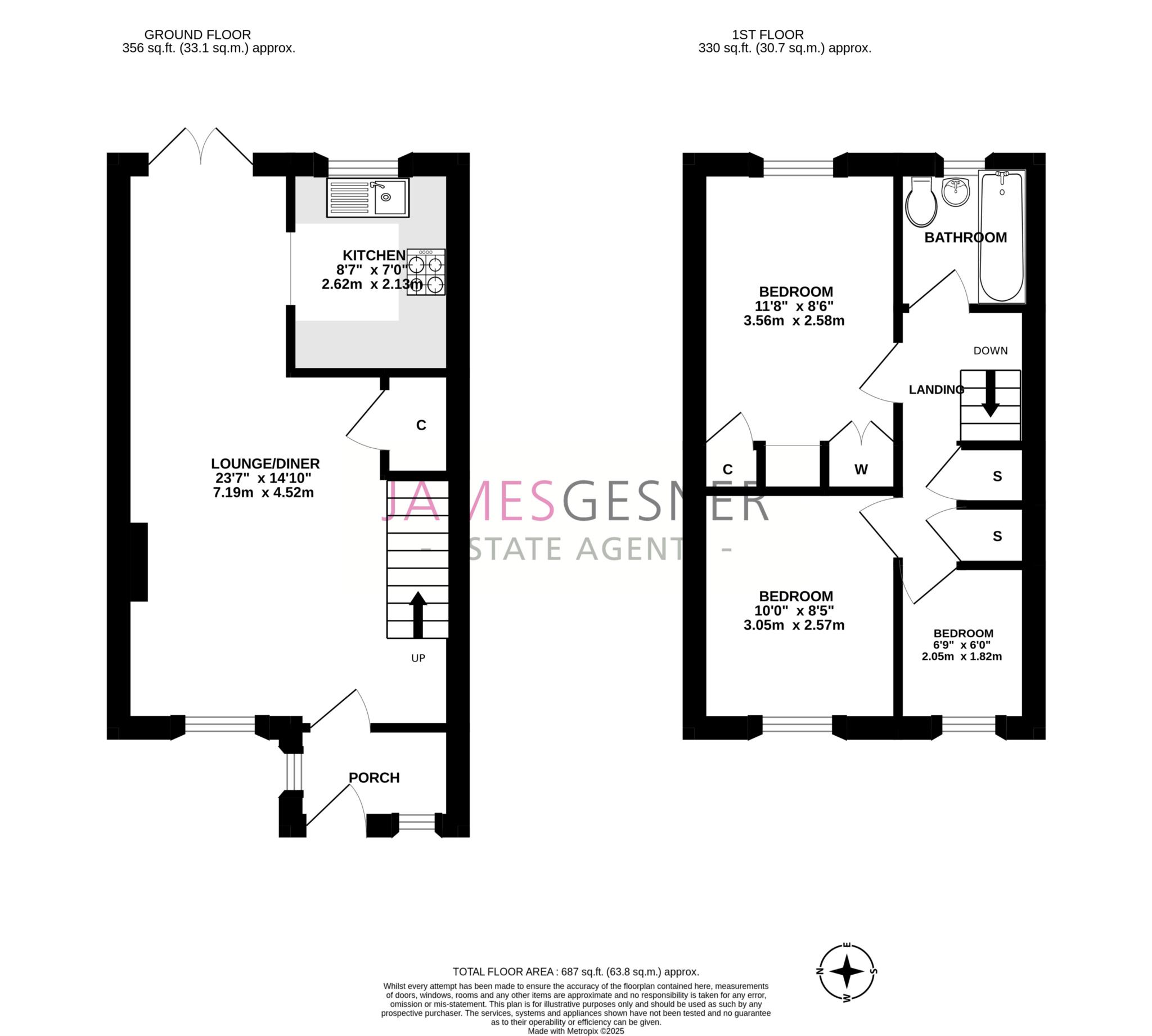 The layout comprises: entrance porch, spacious lounge/diner, modern kitchen, three bedrooms (two doubles and a small single), and a contemporary bathroom. Externally, there are gardens to both the front and rear which have been well maintained. There is also a large storage shed to the side.