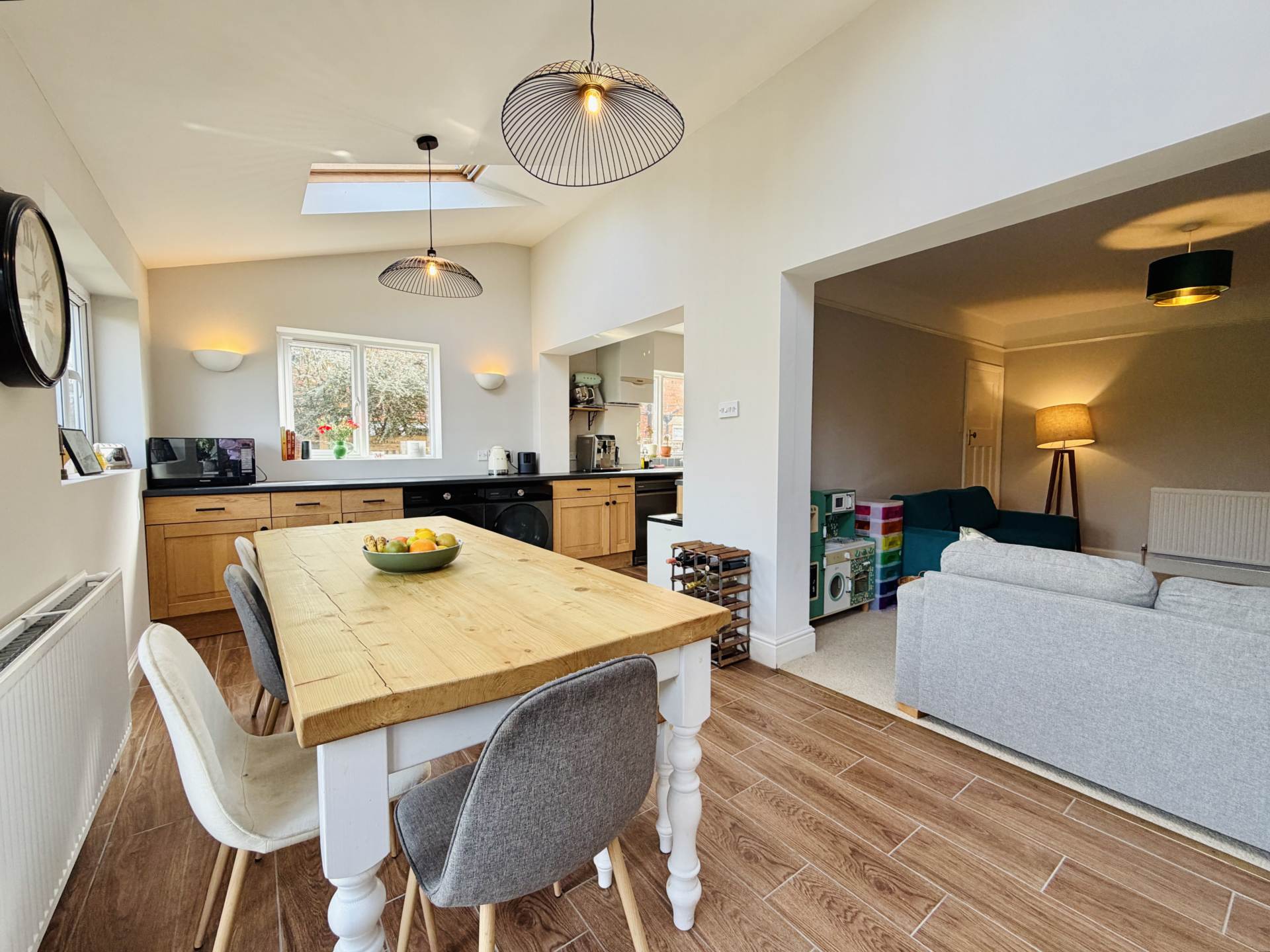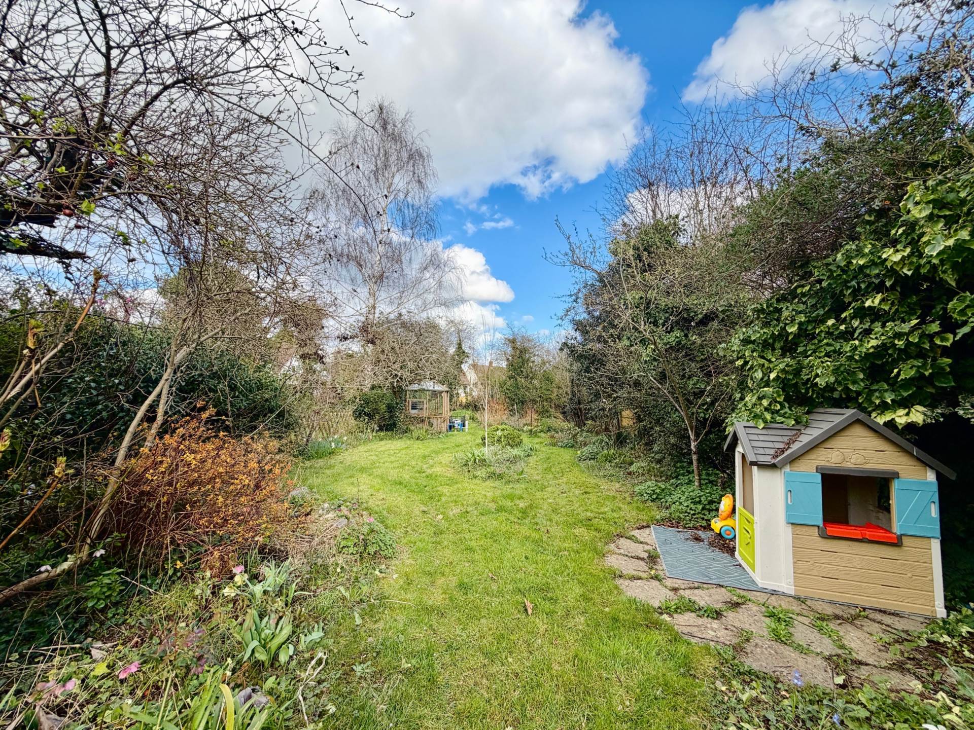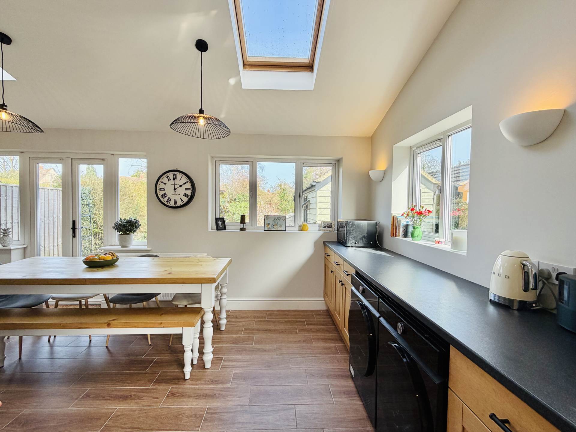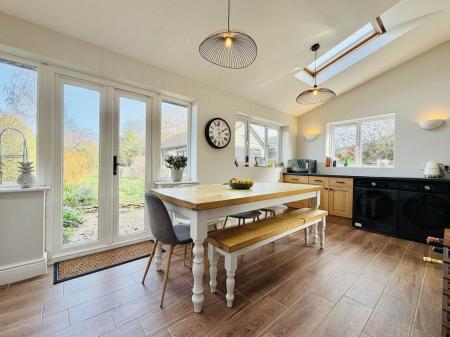 Outside, the rear garden is a particularly appealing feature of the home. Facing north-east and extending to well over 100ft, it offers a delightful combination of lawn, patio seating areas, mature fruit trees, and established shrub borders, providing both privacy and year-round interest.