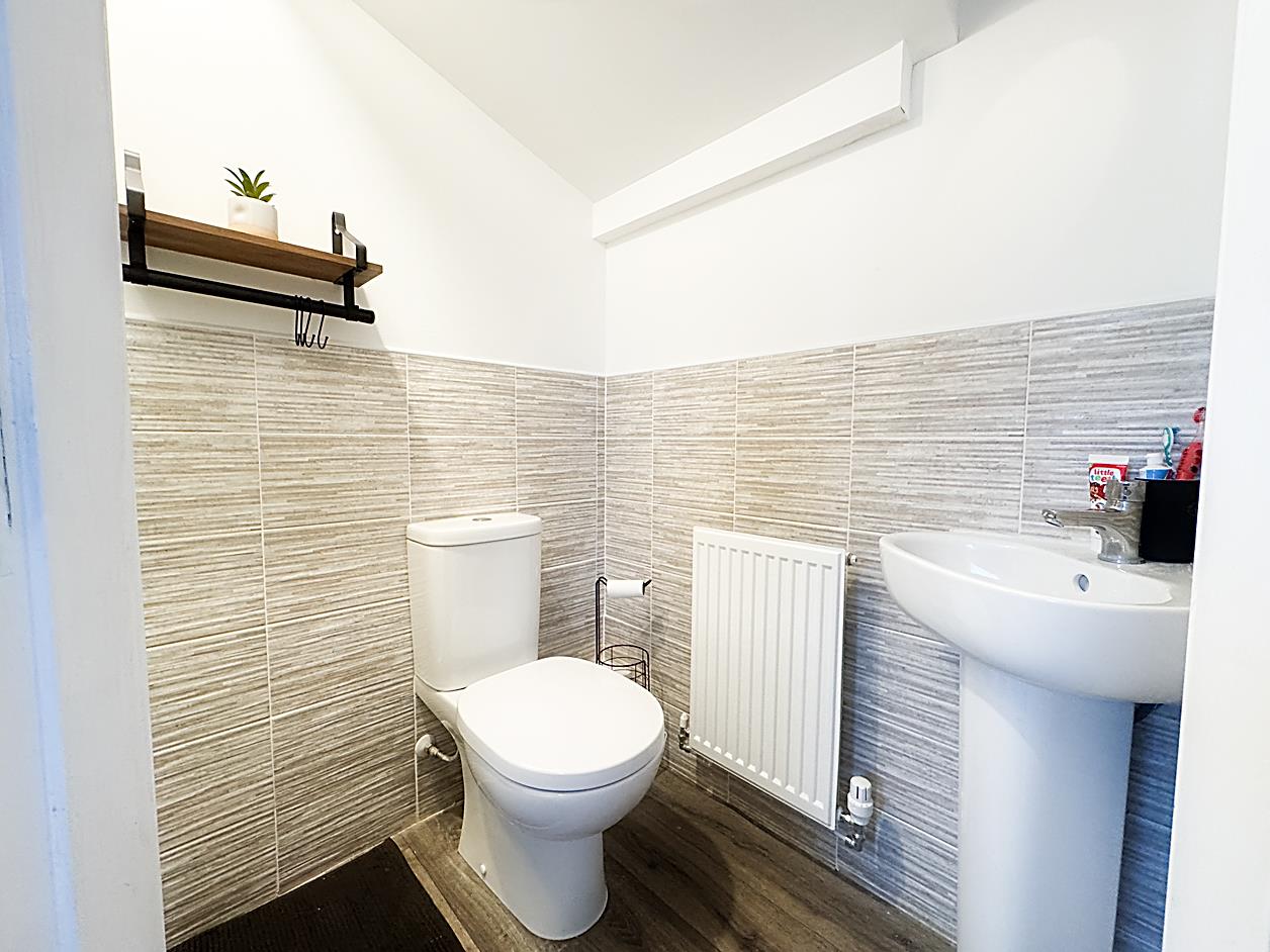 Downstairs Wc - 1.49 x 1.01 (4'10" x 3'3") - Laminate flooring, radiator, WC , wash hand basin.
