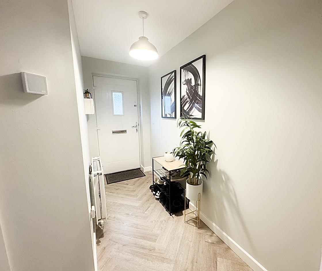 Hallway - Double glazed entrance door into hallway, laminate flooring, radiator, stairs to the first floor landing.