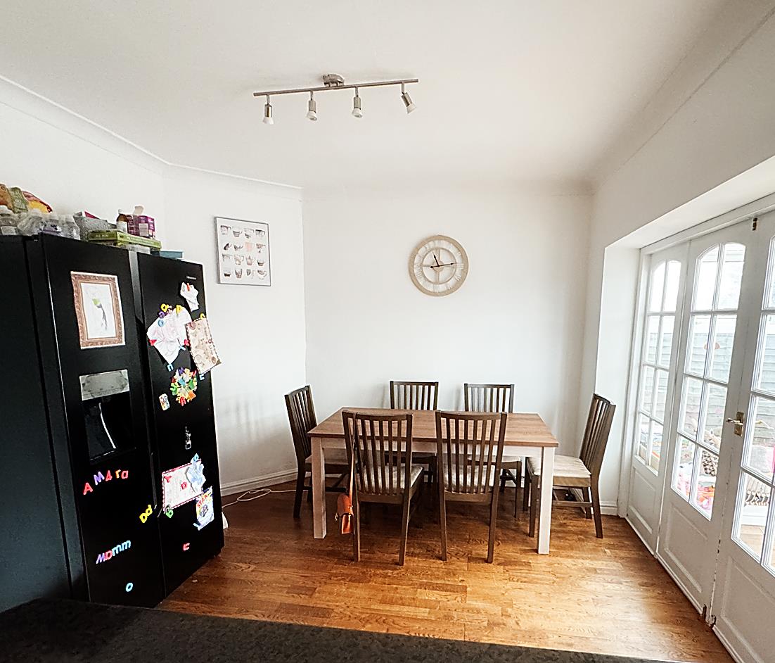 Extended Dining Kitchen - 10'5 x 14'6 - Fitted with a comprehensive range of wall and base units with complementing work surfaces, tiled floor in kitchen area and wood effect laminate flooring to dining area, sink unit with taps and drainer, built in electric hob, oven and extractor hood, skylight, double glazed door providing access into the rear garden, glazed double doors leading into the conservatory, vertical radiator, plumbed for washing machine.