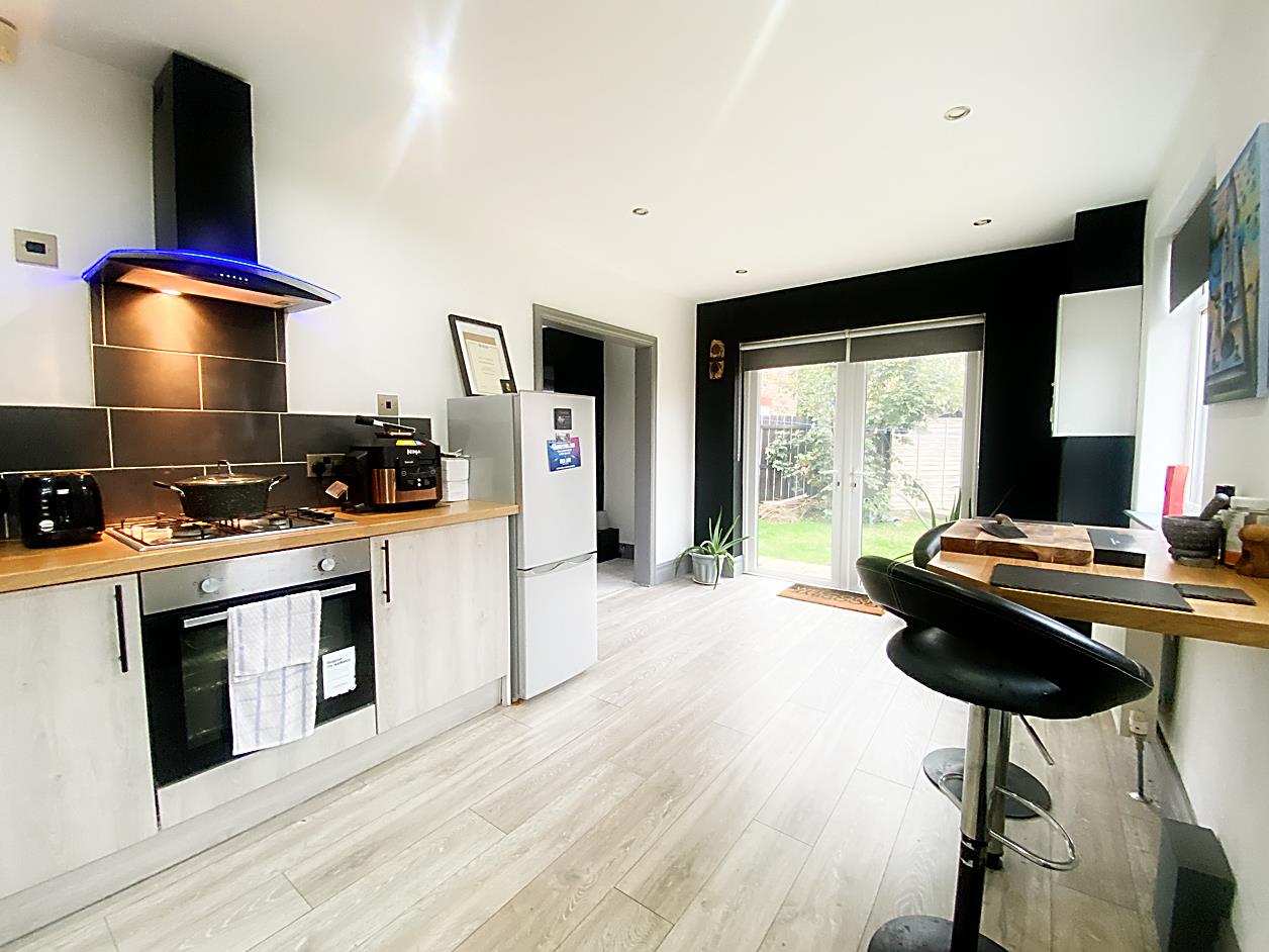 Kitchen/Diner - 5.04 x 2.87 (16'6" x 9'4") - Fitted with a range of base units with work surfaces over, integrated oven and hob with extractor hood over and single drainer sink unit. Double glazed windows, laminate flooring, Upvc door to the rear garden, radiator and double glazed French doors leading to the side garden.