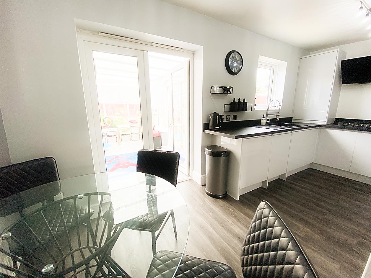 Kitchen/Diner - 4.94 x 2.42 - Fitted with a range of wall and base units with work surfaces over and sink unit, integrated double oven and hob with extractor hood over, integrated fridge/freezer, dishwasher and washing machine, wood effect flooring, radiator and double glazed French doors leading into the conservatory.