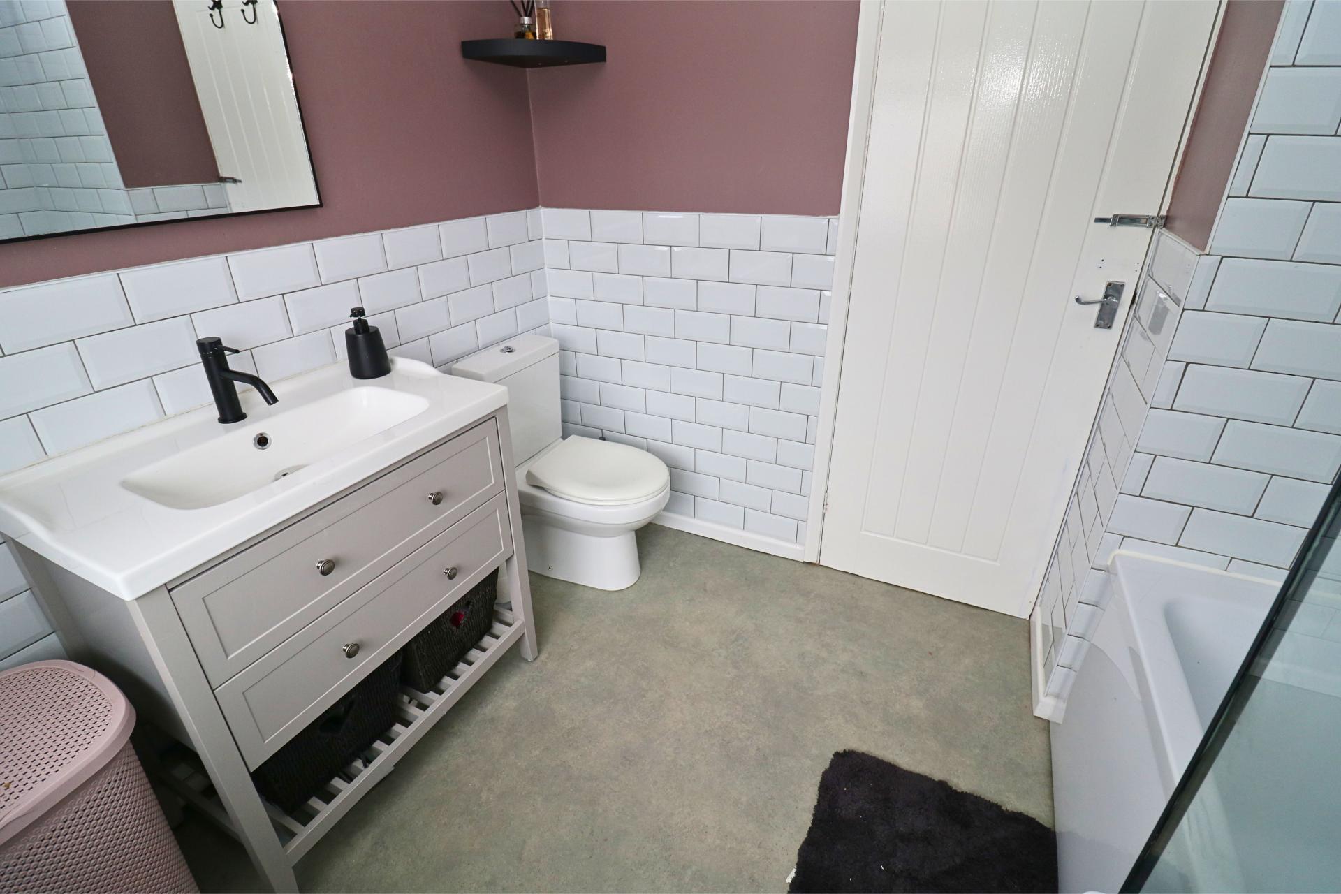 Having bath with shower over, vanity sink unit, low flush W.C., part tiled walls, radiator, down lighters and double glazed obscure window to fore.