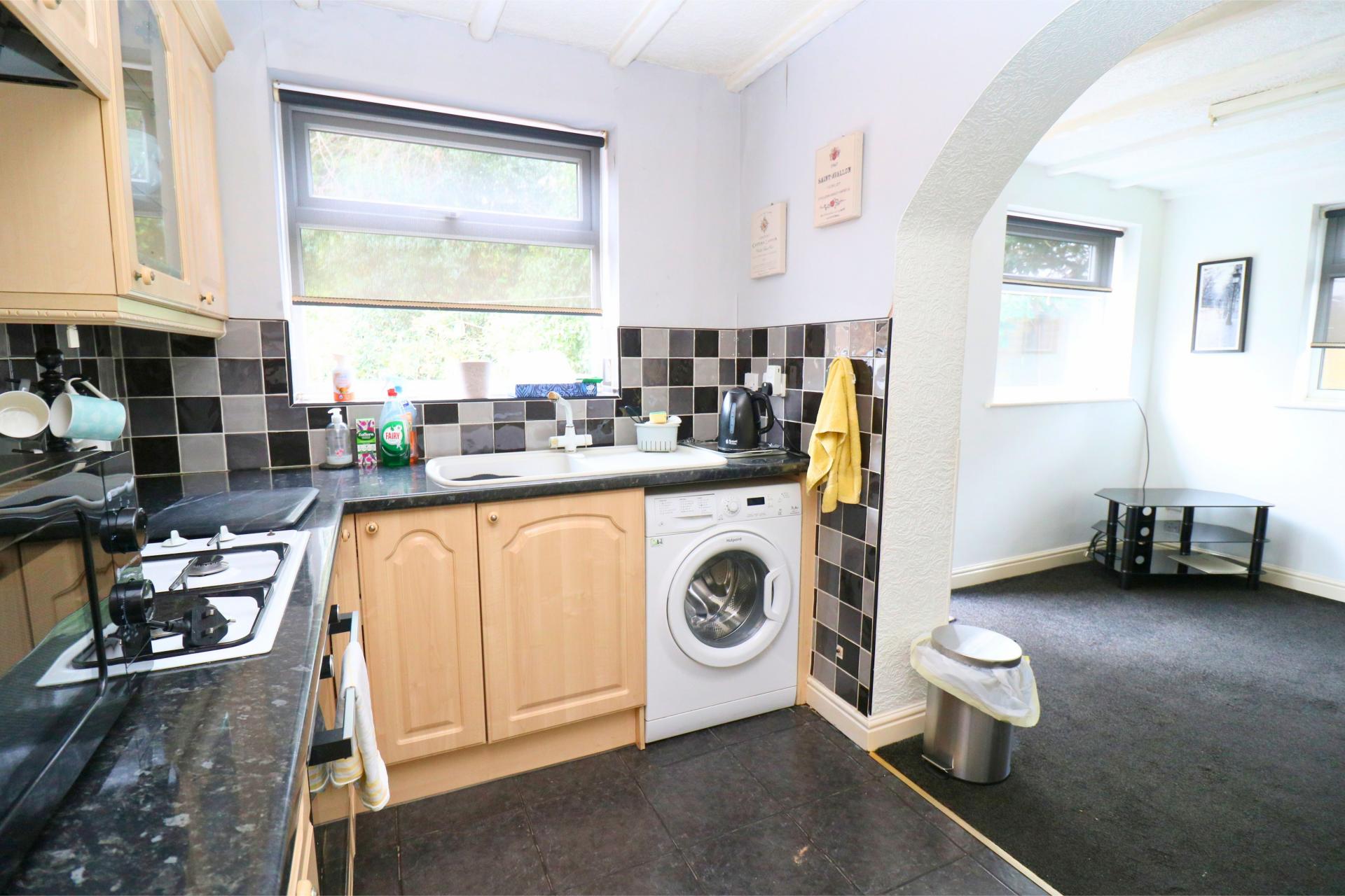 Having a range of wall and base top units with roll top work surfaces, sink with drainer and mixer tap over, four ring gas hob wit extractor over, oven, part tiled walls, under stair storage cupboard, plumbing for washing machine, double glazed window to rear, ceiling light point and archway leading to