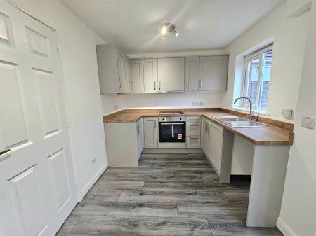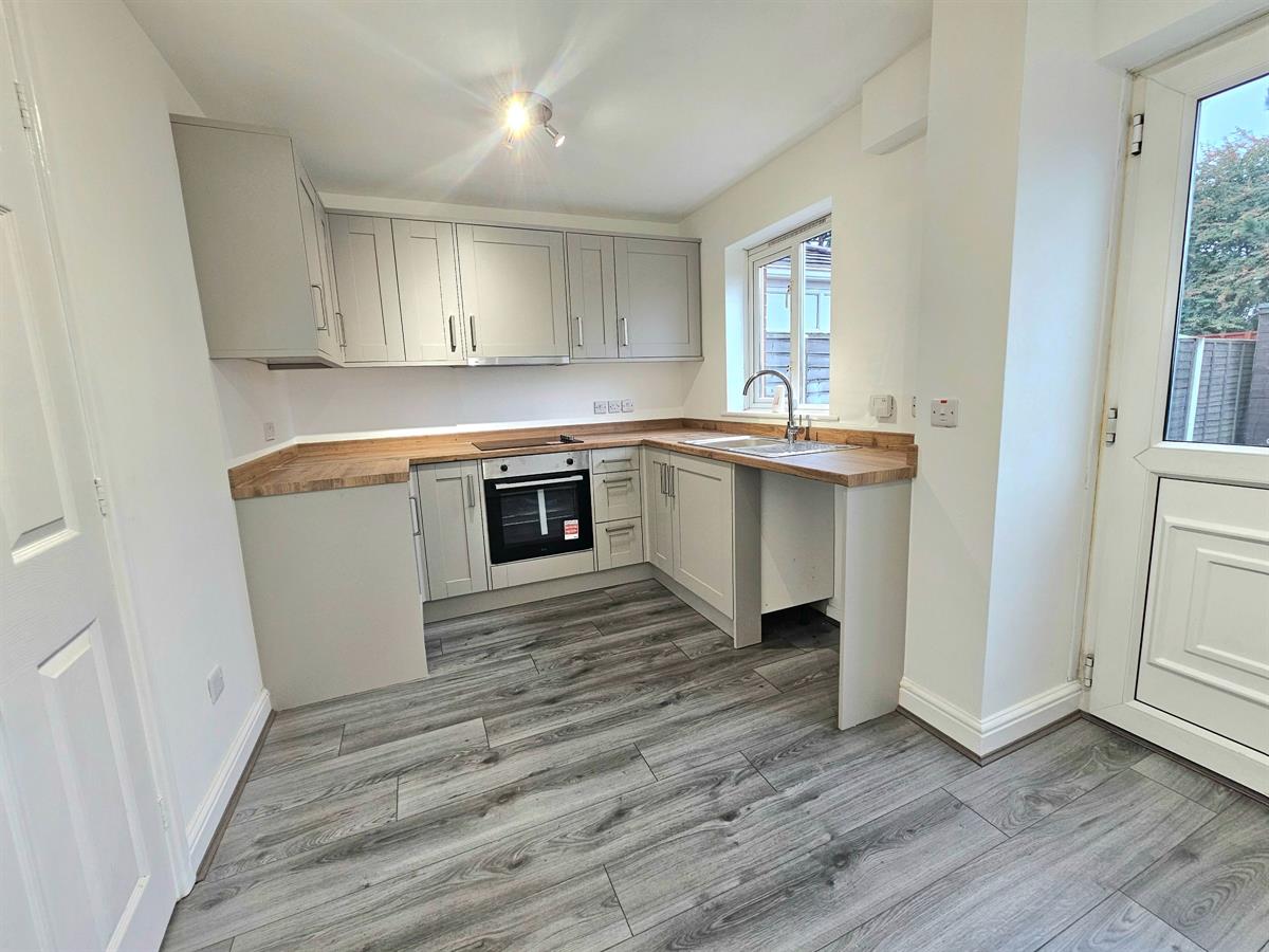 Newly fitted modern kitchen with matching range of wall & base units, inset sink & drainer, electric oven and hob with extractor over, space for washing machine and fridge freezer, laminate wood flooring, radiator, rear aspect double glazed window and door off to garden.